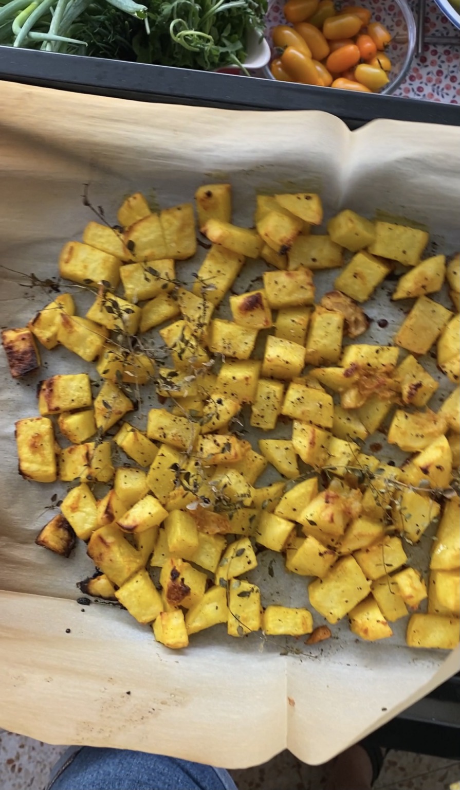 לתפוחי אדמה: נדליק תנור ל200 מעלות: נצפה את קוביות התפוחי אדמה שלנו ב-3 כפות שמן זית, מלח, כורכום, דבש ושום כתושה. נשטח על דף אפייה, נכניס לתנור לחצי שעה עד שהקוביות מזהיבות קלות. נוציא .