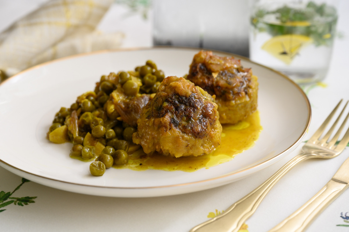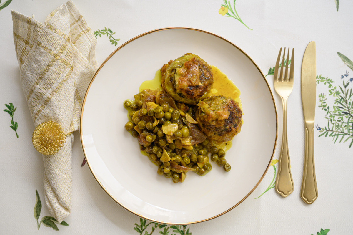 מילוי הארטישוקים: ניצור קציצה בגודל כדור פינג פונג ונהדק לתחתית ארטישוק טוב, ככה נעשה לכל התחתיות, יש גדולות יותר ויש קטנות יותר, תרשו לעצמכם להיות נדיבים במילוי. נעמיד על מגש את כל התחתיות הממולאות יפה (אם יש תחתית “מתנדנדת” נחתוך מעט מהבסיס שתעמוד יציב)