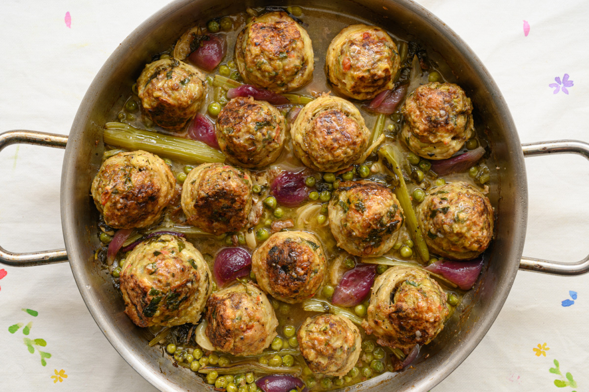 מילוי הארטישוקים: ניצור קציצה בגודל כדור פינג פונג ונהדק לתחתית ארטישוק טוב, ככה נעשה לכל התחתיות, יש גדולות יותר ויש קטנות יותר, תרשו לעצמכם להיות נדיבים במילוי. נעמיד על מגש את כל התחתיות הממולאות יפה (אם יש תחתית “מתנדנדת” נחתוך מעט מהבסיס שתעמוד יציב)