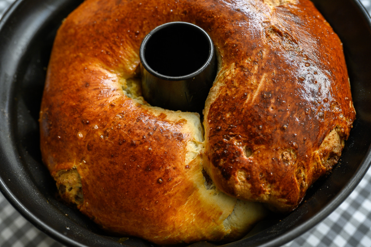ושוב נמרח מעט חמאה וממרח אגוזים נקפל ועכשיו נרדד למלבן, הפעם נגלגל את הבצק לכדי נחש שמנמנן. הקוטר של הנחש העגול צריך להתאים לקוטר התבנית, אם הוא יותר גדול נחתוך את המיותר, אם הוא יותר קטן נמתח אותו מעט, נכניס לתבנית קוגלהוף משומנת היטב. (שימו לב: רק אם יש תבנית קוגלהוף אנחנו מודדים, כי כשהופכים אנחנו רוצים שתעמוד יציב ותתפח שווה!! בתבנית עגולה רגילה נניח את הנחש בתבנית איך שבא!!)