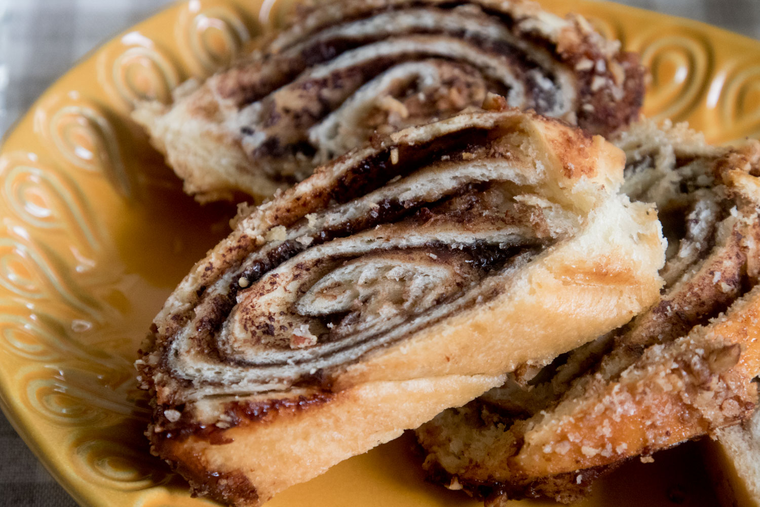 50 גר’ חמאה למריחה על דף הבצק, מעליו את פירורי הקינמון אגוזים, נהדק ונגלגל.