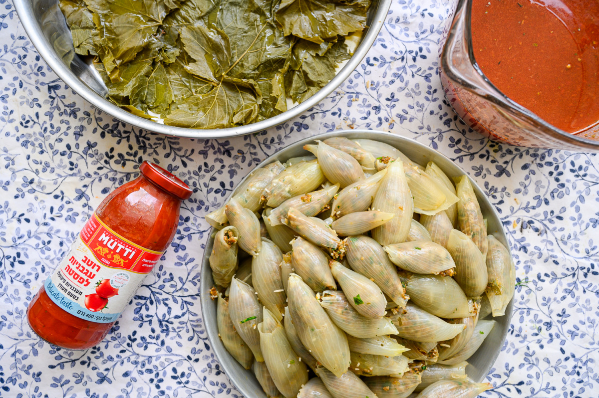 המילוי: במעבד נקצוץ: עלי גפן, שאריות בצל, עשבי תיבול ושום (אפשר כמובן לקצוץ עשבים ולכתוש שום ידני), נוסיף בשר טחון, אורז מסונן, שליש רוטב עגבניות, רכז רימונים, מלח, נענע יבשה, פפריקה ושמן זית. נלוש הכל היטב.