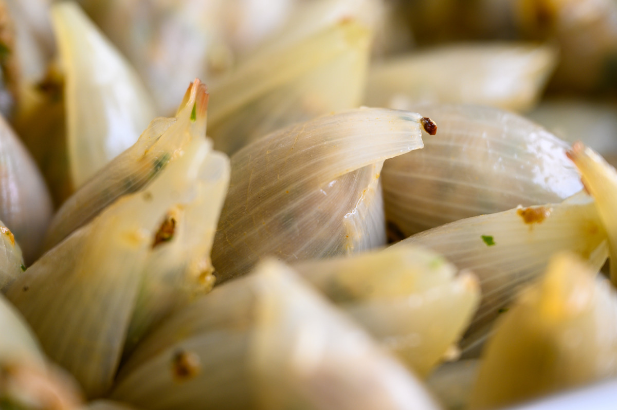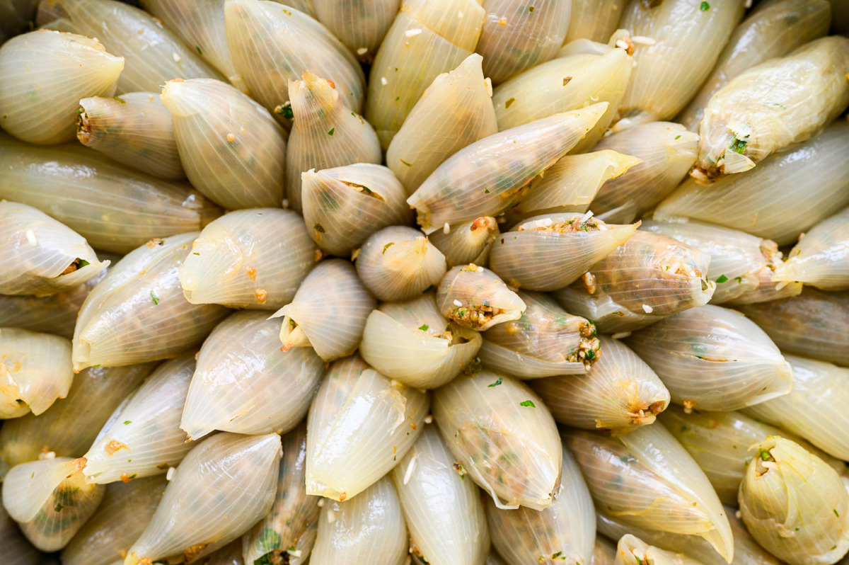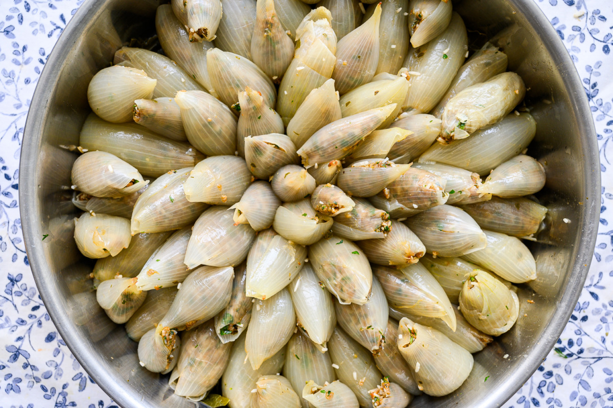 הבצלים: נקלוף הבצלים ונחרוץ עם סכין כל בצל עד המרכז, נבשל בסיר עם כפית מלח ושפע מים על אש גבוהה סיר מכוסה כ20 דקות או עד ריכוך, נסנן הבצלים מהמים ונצנן לחלוטין. אחרי בישול יהיה לנו קל יותר לפרק את פרח הבצל לגלדים.
