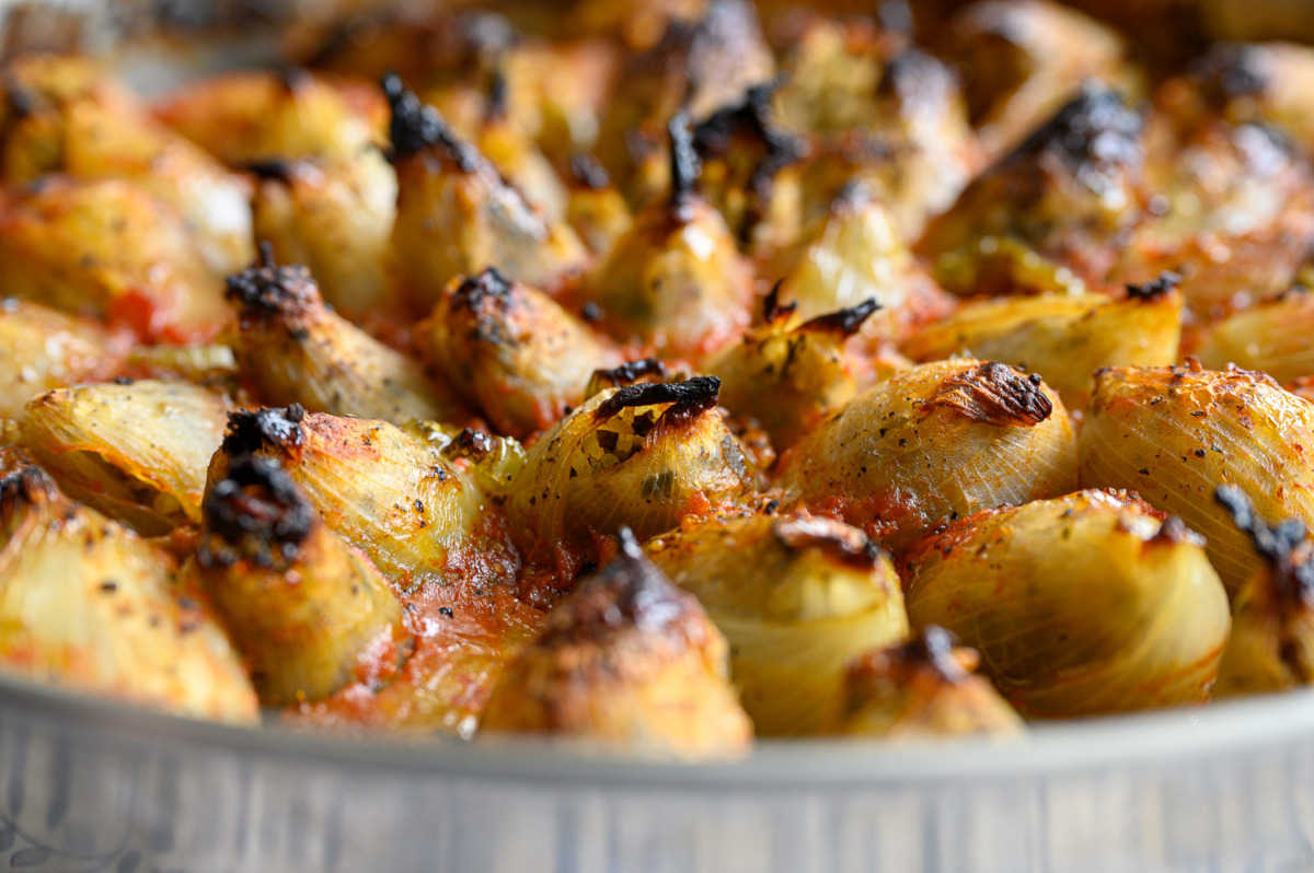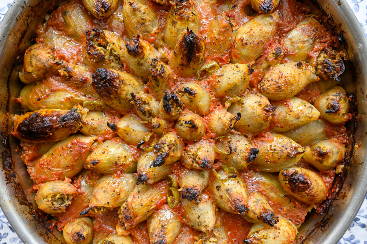 הסיר: ניצוק רבע כוס שמן זית בתחתית הסיר, נכסה הקרקעית בשמיכת עלי גפן, נשבץ את הבצלים, ניצוק את הרוטב שרק ראשי הבצל יציצו (את מי הרוטב שנשארו נשמור), נרטיב נייר אפייה ונכסה, נשגר לתנור לשעתיים 150 מעלות (אם צריך נבדוק אחרי שעה ונוסיף במהלך האפייה עוד מימי הרוטב שנותרו), נוריד נייר אפייה נעלה חום ל200 מעלות ונאפה עוד כ20-30 דקות.
