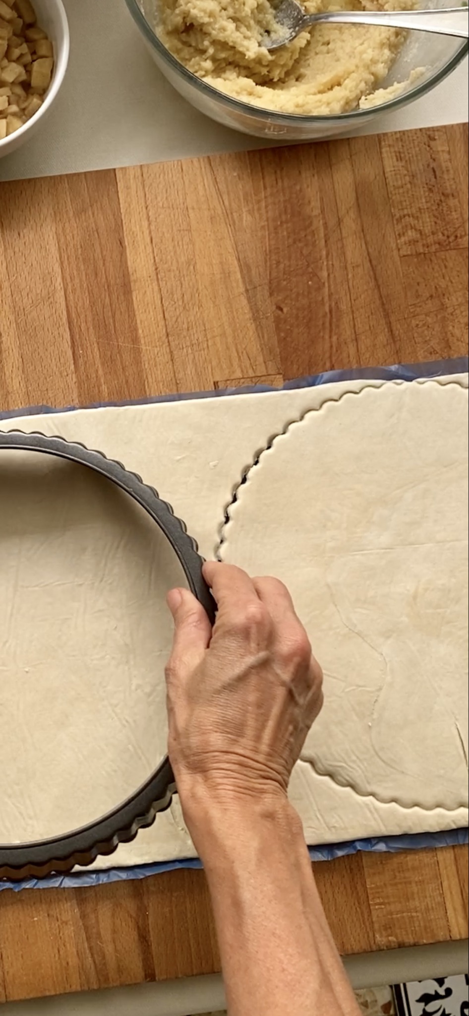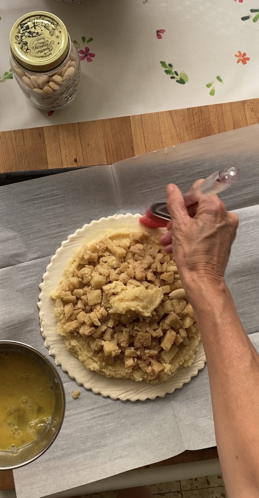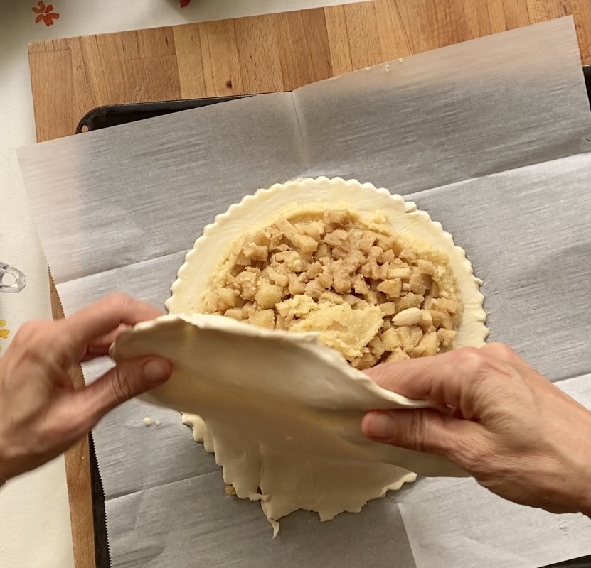 3. הרכבה: על דף אפייה נקרוץ עם טבעת פאי או צלחת בקוטר 24 שני עיגולים של בצק עלים (לא נרדד!). נניח את עיגול הבסיס על דף האפייה, במרכזו נמרח את קרם השקדים , אך נשאיר שוליים של 2 וחצי ס”מ, מעליו נערום את התפוחים, נבריש בביצה טרופה את שולי העיגול, נסגור עם העלה העגול הנוסף את הפאי, נצבוט טוב טוב את הקצוות, נבריש היטב את פני העוגה וצדדיה ונכניס למקפיא לחצי שעה/שעה, כדי שיהיה קל לשרטט על פני העוגה.