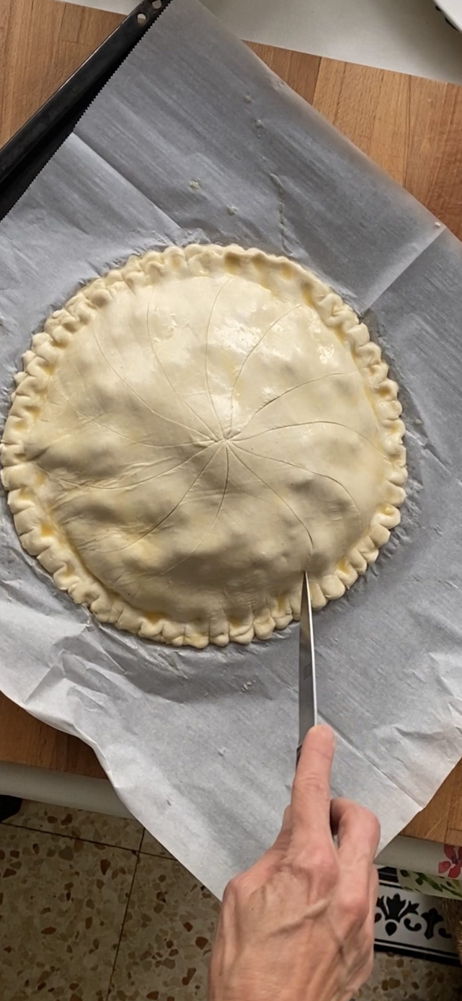 4. האפייה: נדליק תנור חום 200 מעלות. נוציא מהמקפיא, עכשיו קל לצייר על פני העוגה, עם סכין חדודה, ניצור במרכז פתח אוורור קטן, ואז נצייר בחריצה עדינה מה שבא לנו, אפשר גם לכתוב נגיד “שנה טובה” או לצייר תפוח