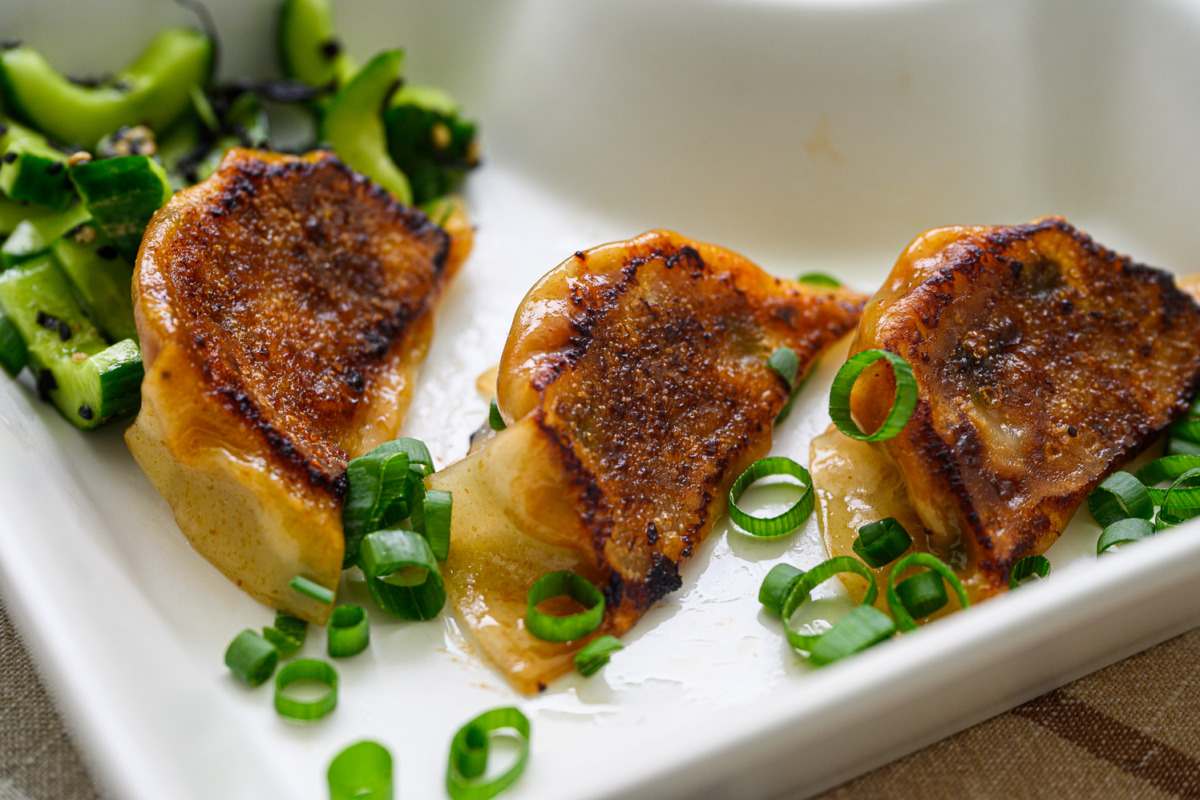 עם מעט שמן (2 כפות) על להבה גבוהה, נניח את הגיוזות שלנו איך שבא (כל נגלה כמה יחד), נכסה מחבת עם מכסה לדקה אחת בדיוק, מוסיפה ¾ כוס מים ומכסה מחבת ל3 וחצי דקות. ולבסוף יוצקת כף אחת של סויה ומכסה ל30 שניות. מכבה. משאירה את הגיוזות לעוד 2 דקות על הכיריים החמימים ללא מכסה ומוציאה אותן לכלי הגשה.