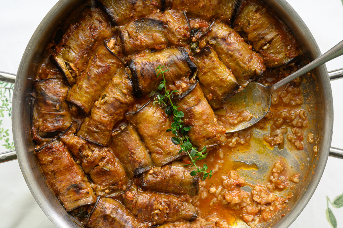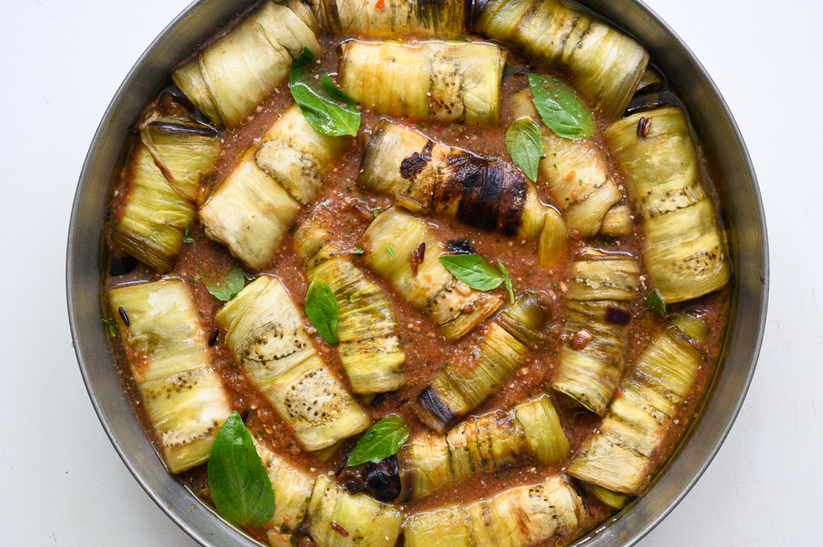 5. בכל גליל של חציל נניח כפית יפה של מילוי ונגלגל ונניח על מרצפות העגבניה. ככה נעשה עם כולם. ניצוק מעל את הרוטב שיכסה את הגלילים. נכסה סיר ונבשל כשעתיים על אש קטנה או בתנור 150 מעלות כ-שעתיים וחצי (אחרי שעה נבדוק אם יש מספיק מים, אם אין נוסיף)