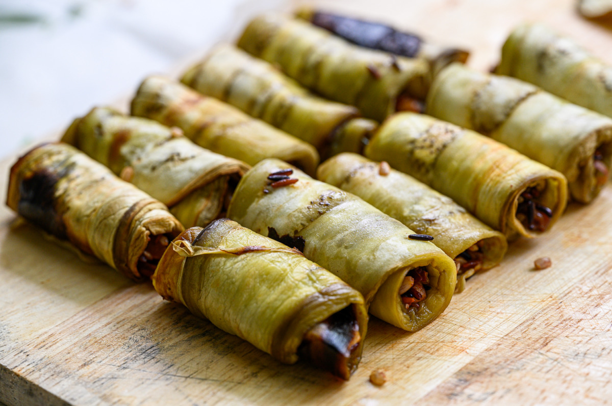 1. פרוסות החציל אינן אמורות להזהיב בתנור, רק להתרכך שיהיה לנו קל לגלגל. קפיש?