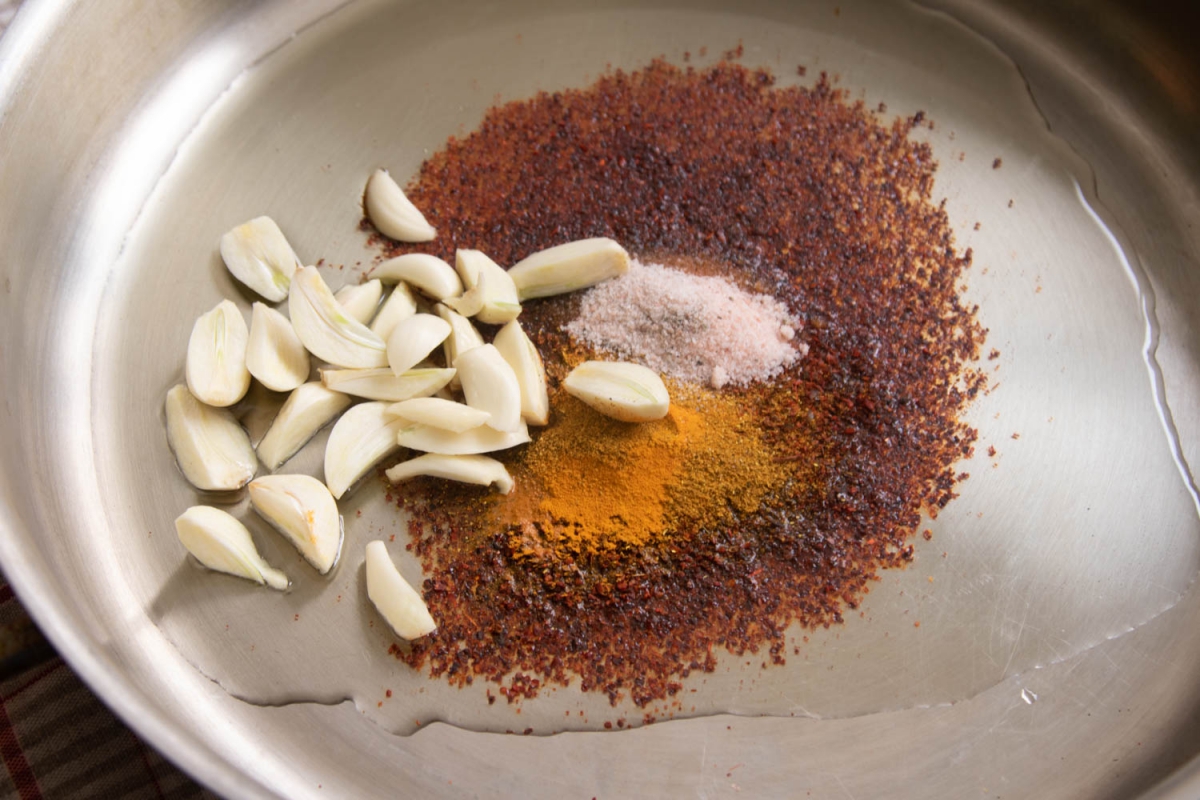 לפני שמדליקה את הכיריים, ניצוק שמן לסיר רחב, נפזר עליו את שיני השום, 2 כפות פפריקה, כמון, כורכום, מלח פלפל נערבב עם מזלג ואז נניח את פרוסות הדג בתפזורת יפה ונלטף אותם עם שמן התבלינים משני הצדדים, שיקבלו קצת צבע.