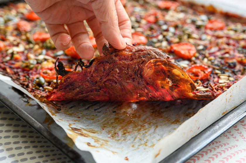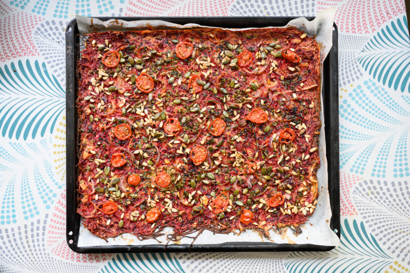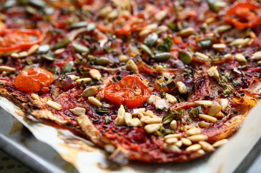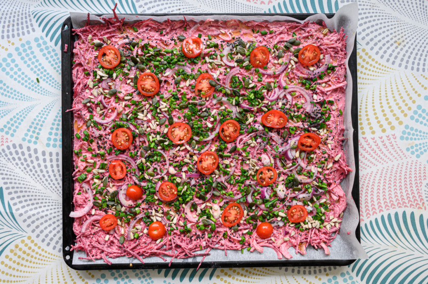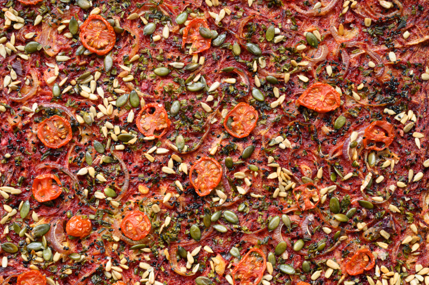3. על דף אפייה משומן טוב טוב נשטח את התערובת, ממש נטפח עליה עם הידיים, נעזור לה להגיע לכל דפנות התבנית , נעטר בטבעות שאלוט או בצל סגול קטן, פרוסות דקיקות של עגבניה, טבעות פלפל ירוק חריף (לא חובה) ו2-3 כפות גרעיני חמניה