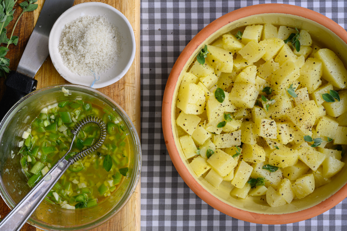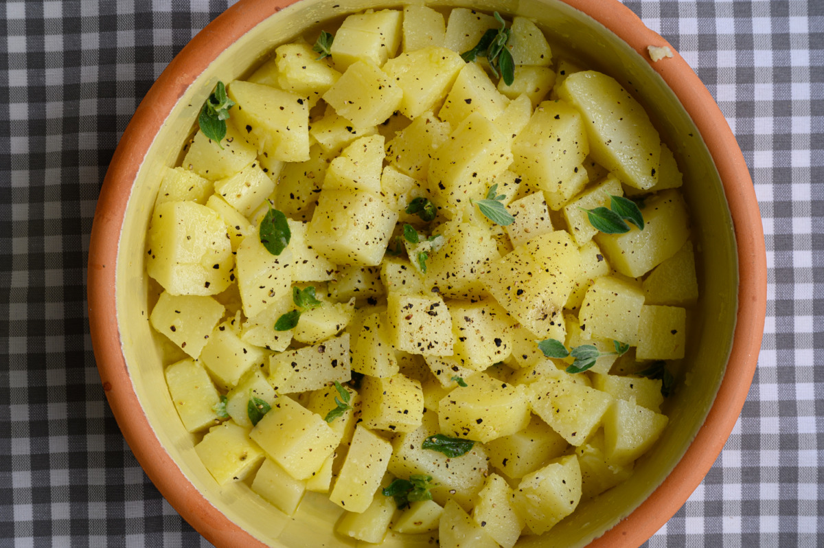 2-3 תפוחי אדמה בינוניים קלופים מבושלים בשלמותם. מקוררים (כשתפוחי אדמה מבושלים וקרים אין בעיה לחתוך יפה, אפשר להכניס למקרר ואפשר לבשל כשהם כבר חתוכים לקוביות של 3 ס”מ)