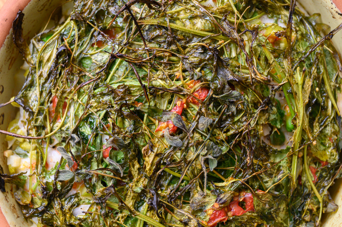 3. בקערה נערבב: עלי רוקט עם רבע כפית מלח, כף מיץ לימון, כף שמן זית, נסחוט עגבניה בשלה ומעט פלפל שחור. נערבב ונניח את הבוקה היפהפה הזה על הדגים. ממש נכסה אותם בשמיכת עשבי תיבול. נשגר לתנורל-20 דקות. נגיש עם סלט מלפפון קייצי. נפלא