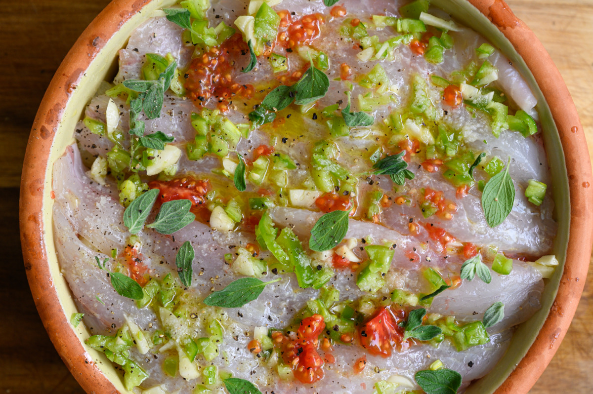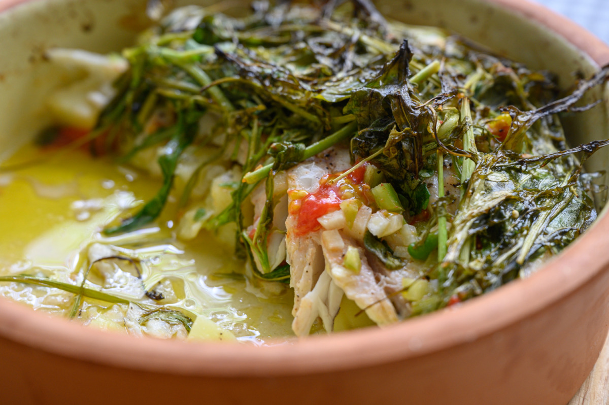 אני כ”כ מתגעגעת לאורנה ואלה, בית הקפה המיתולוגי בשכונה שלי, אני חושבת שהן ההגדרה לאוכל נשי ישראלי טעים. מדי פעם אלה ואני נפגשות ומבשלות יחד, אני אוהבת לראות את אלה עובדת מחול הידיים שלה מהפנט, מרגיע ומבטיח שתצאי גם שבעה וגם מרוצה מאוד. ממנה למדתי שאם מכסים דגים בשמיכת עשבי תיבול, זה שומר על נימוחות אין גבול. המנה הזאת היא וריאציה על זה. רק בקרקעית התבנית אני פורשת שטיח קוביות תפוחי אדמה שבישלתי, עליהן אני מניחה את הדגים ומכסה אותם בשמיכת עשבי תיבול. הנראות של המנה פחות מוצלחת מטעמה המופלא, אבל זאת אולי מנת הדגים הטעימה ביותר שאכלתי ואכלתי. כשאני מכינה אותה היא תמיד נגמרת עד הסוף. כשאני מארחת תמיד מבקשים מתכון. לא תאמינו כמה זה קל. סמנו כוכב זהב ליד המנה הזאת, אתם תחזרו אליה פעם אחרי פעם אחרי פעם ותכינו אותה, לא תצטערו.