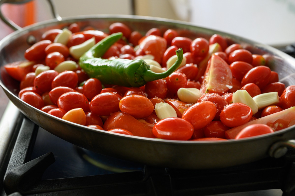2. נכניס למחבת את עגבניות השרי, עגבניות, הפלפל החריף השלם, שיני השום, שמן הזית, זעתר, מלח ובלסמי. נבשל על הכיריים ללא טיפת מים על להבה גבוהה עד שהעגבניות יכנעו ויתחילו להגיר מיצים טעימים כ- 10 דקות. מדי פעם נשקשק את הסיר שלא ידבקו לתחתית. ננמיך חום להכי נמוך.