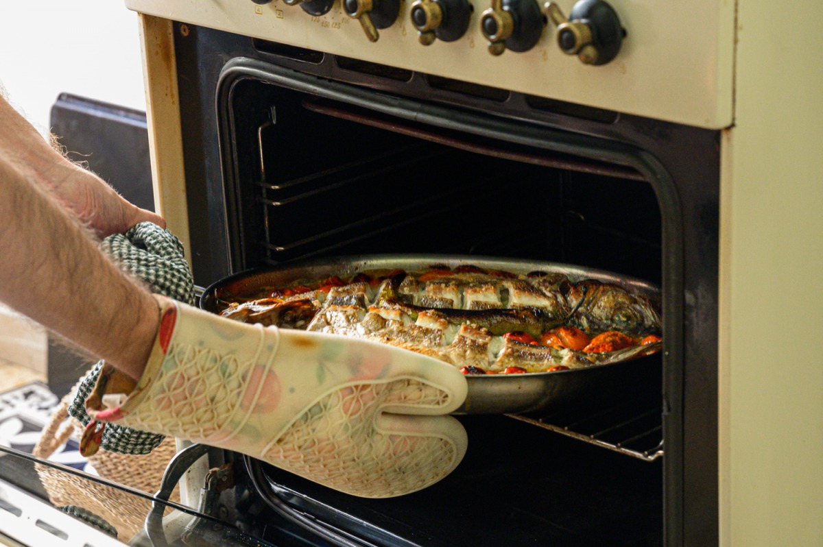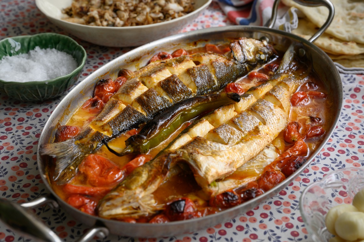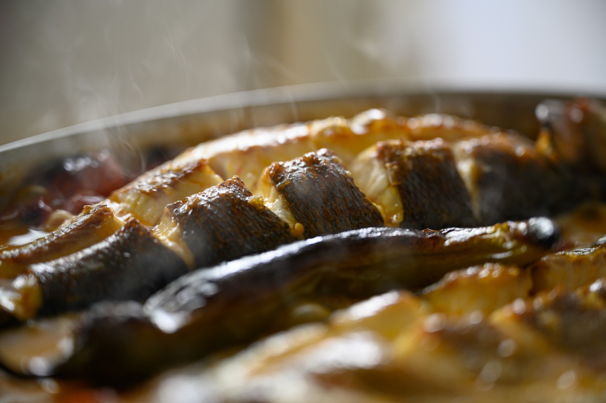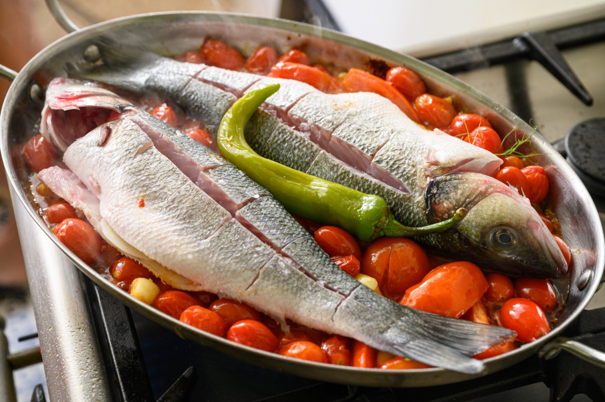4. נניח מעל מצע העגבניות המתבשל את הדגים שלנו, נמשיך לבשל כ-10 דקות על להבה בינונית נמוכה. נכניס לתנור חום גבוה 190 מעלות כ-25 דקות