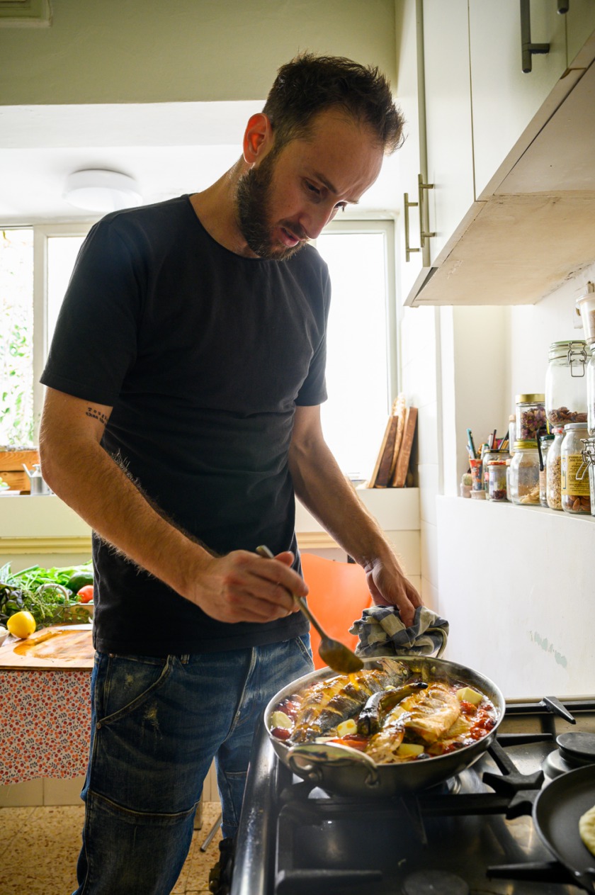 עמיחי ואני אוהבים לבשל יחד. באחת הפעמים עשינו מפגש דגים, ציירנו מתכוני דגים להנאתנו. זה המתכון הראשון מהמפגש ההוא.  לראות את עמיחי מכין את המנה האובלית הפנומנלית הזאת, היה כמו לצפות באומן. בחיי שזו תמונה ולא ציור. זה כל כך טעים ותכלס אחד הדברים הקלים להכנה.