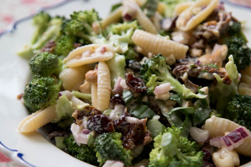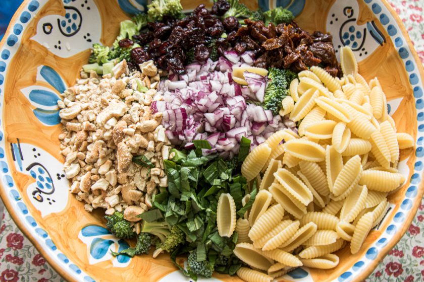 נרכיב את הסלט: פרחי ברוקולי, פסטה, בצל סגול,חמוציות, עגבניות מיובשות, אגוזי קשיו ובזיליקום