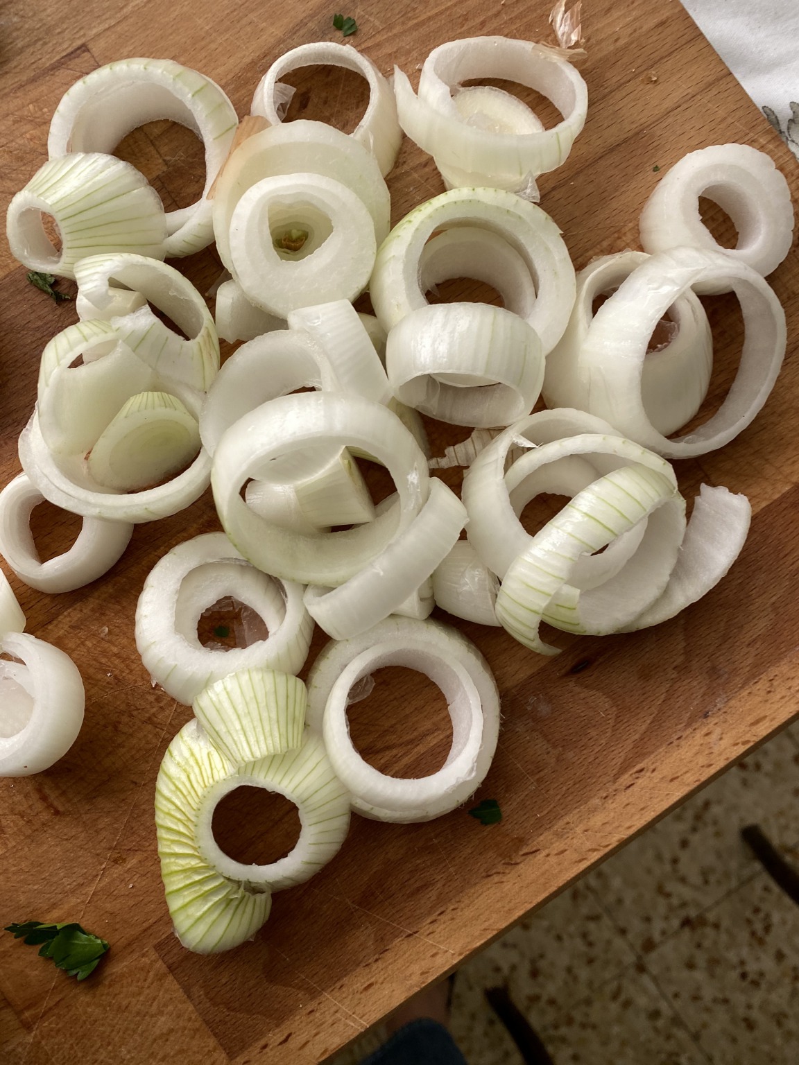 2 בצלים לבנים בינוניים חתוכים ומופרדים לטבעות בעובי סנטימטר