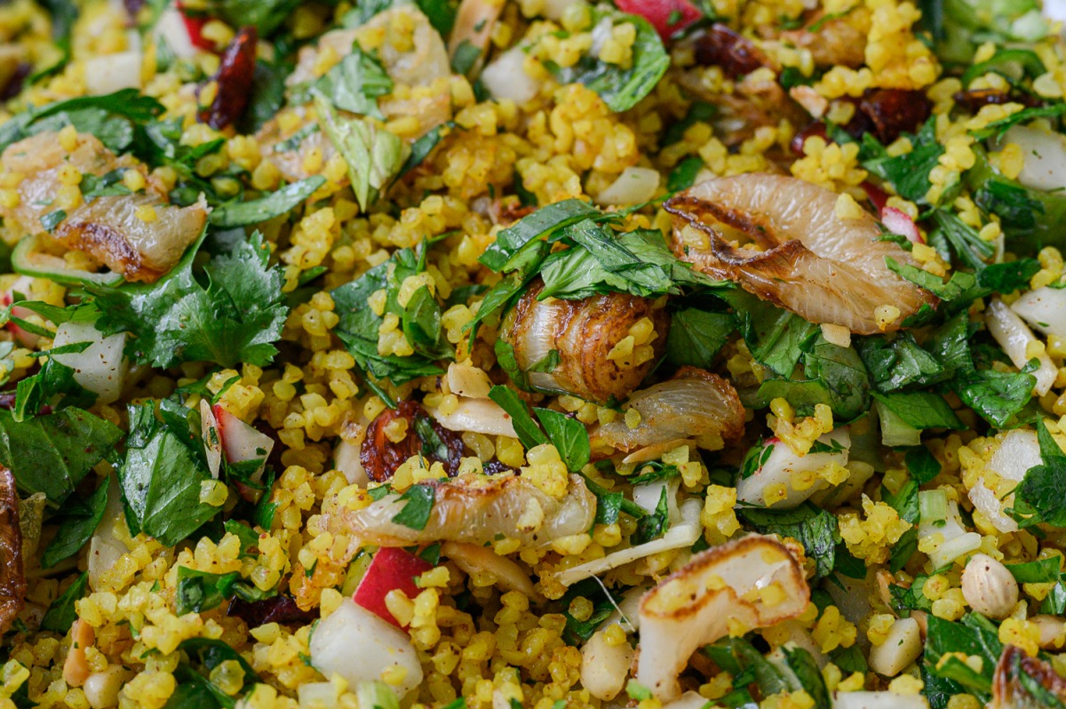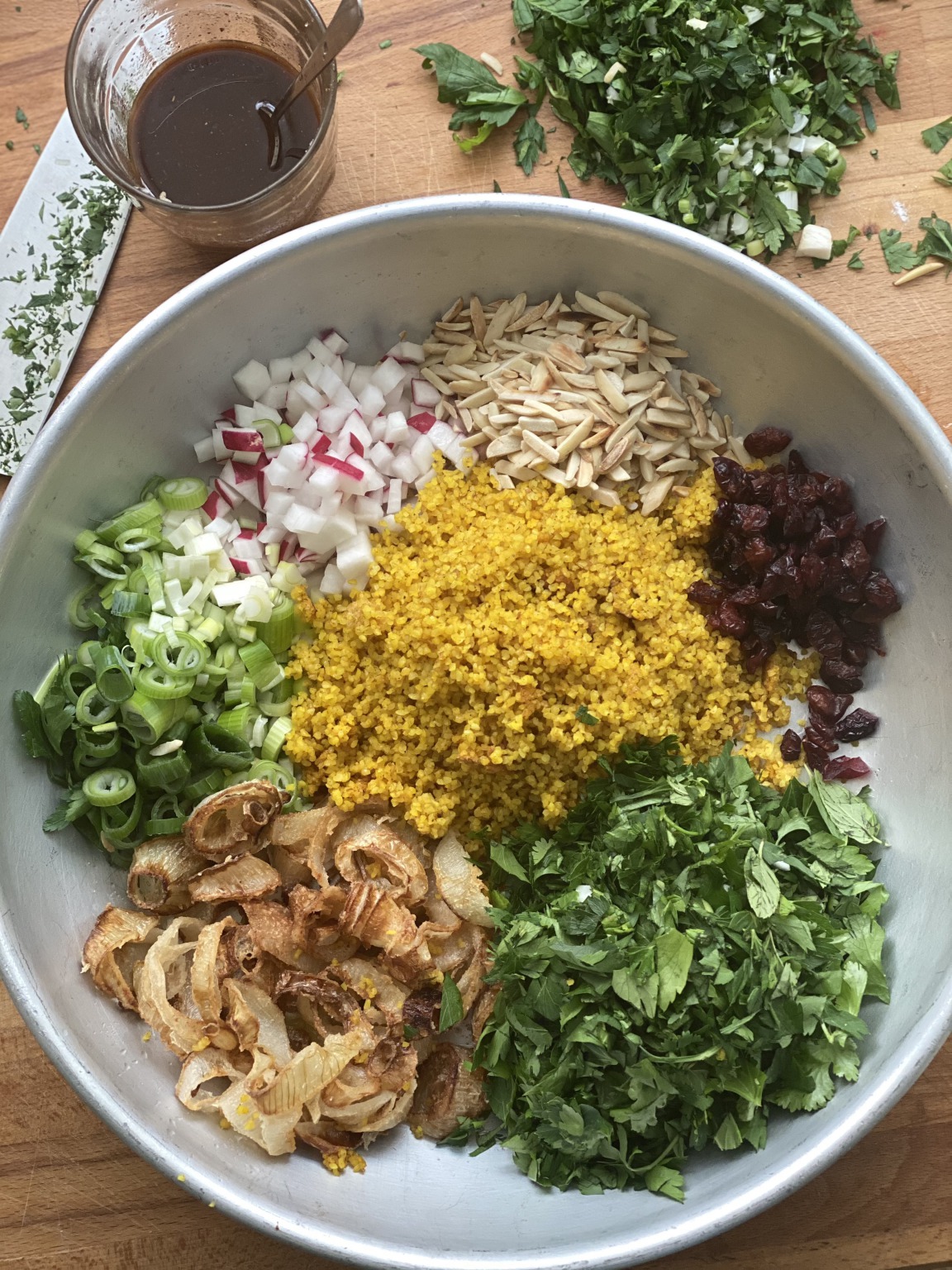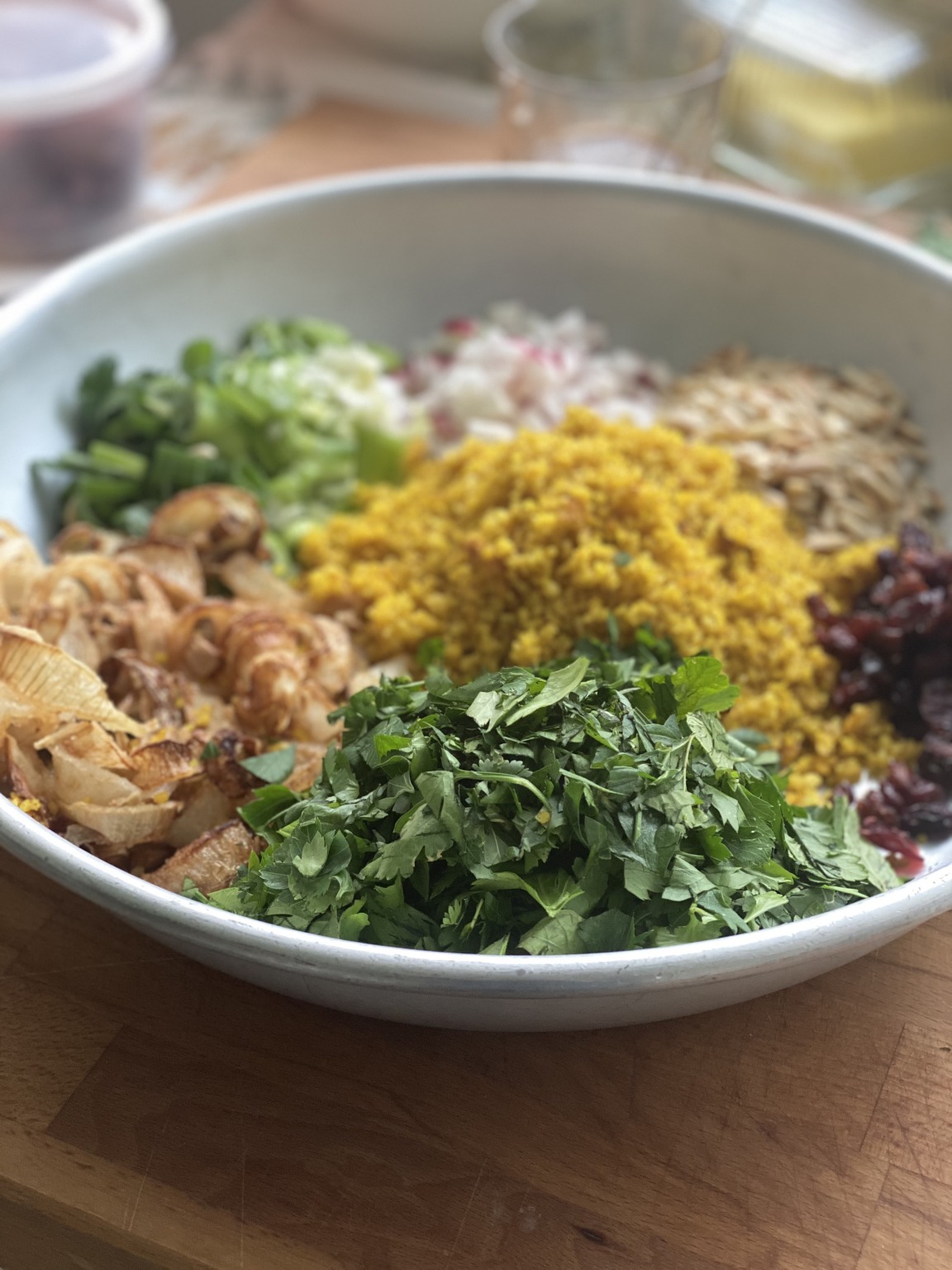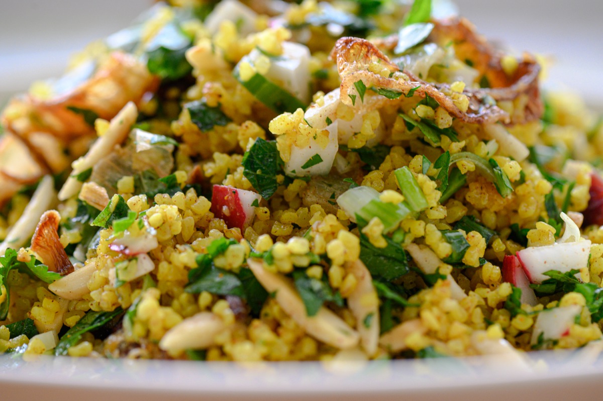 4. נעביר לצלחת הגשה יפה: הבורגול, עשבי התיבול, בצל ירוק, שקדים קלויים, חמוציות, קוביות צנון, טבעות הבצל. רק לפני הגשה נערבב עם הרוטב.