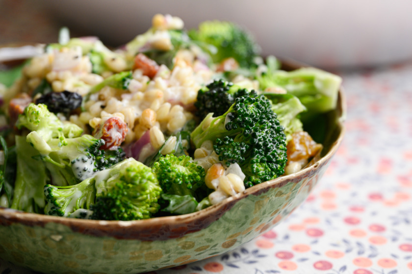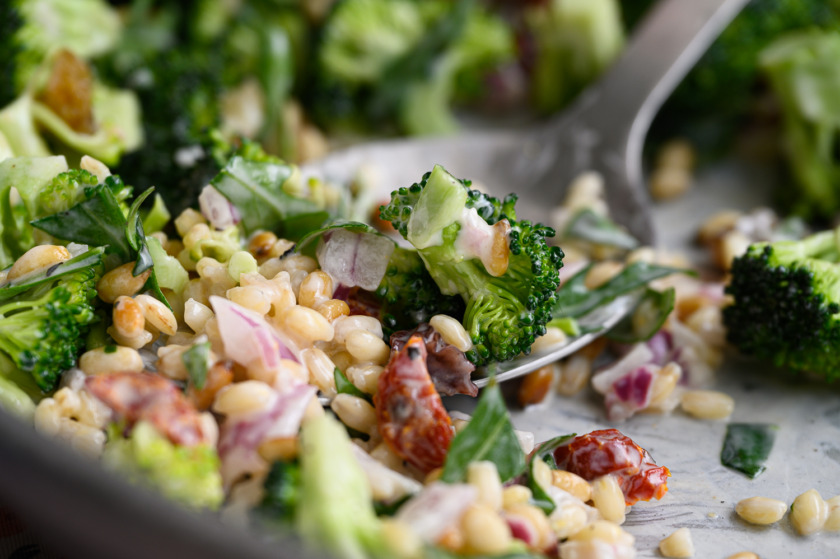 נרכיב את הסלט: פרחי ברוקולי, גריסים, בצל סגול,חמוציות, עגבניות מיובשות, אגוזים קלויים, בזיליקום