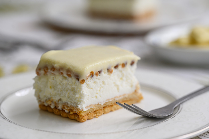 ניצוק התערובת על בסיס הביסקוויטים, נשגר לתנור לשעה ורבע. נצנן (שימו לב: כל תנור מעט אחר, יכול להיות שעה או שעה ועשרים)