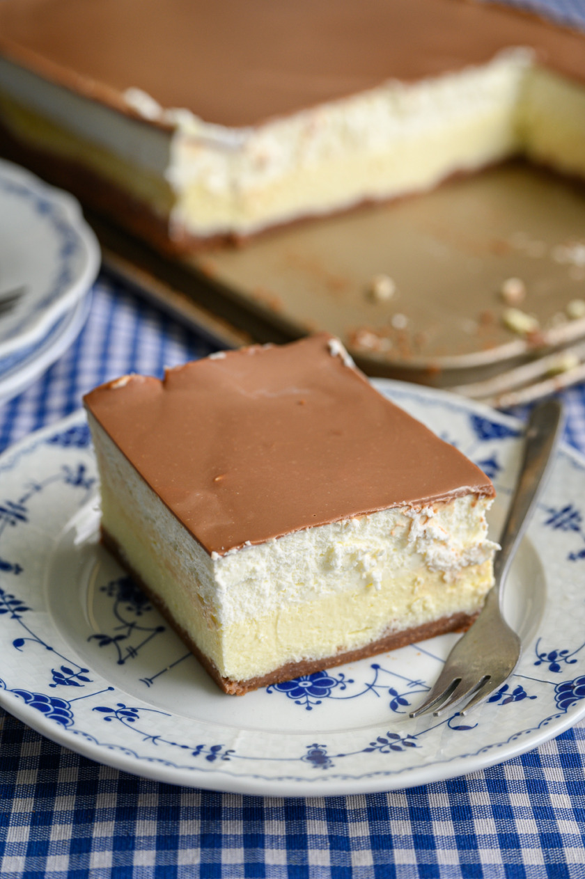 נביא לרתיחה או נחמם במיקרו שליש כוס שמנת מתוקה, נוסיף 100 גרם שוקולד חלב שיימס אט אט. נערבב היטב וניצוק שכבה דקה על העוגה.
