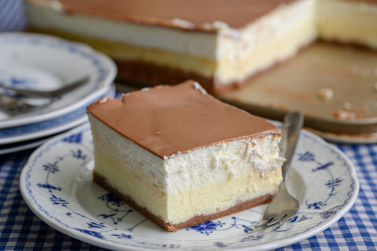נביא לרתיחה או נחמם במיקרו שליש כוס שמנת מתוקה, נוסיף 100 גרם שוקולד חלב שיימס אט אט. נערבב היטב וניצוק שכבה דקה על העוגה.