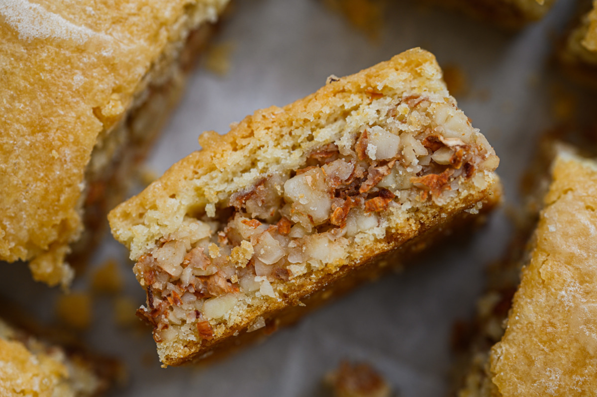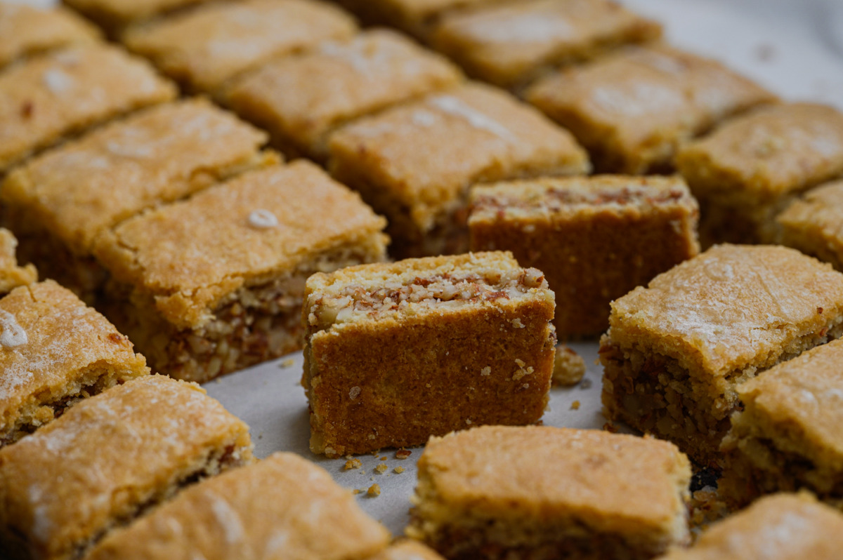 7. נזליף את הסירופ באופן מקושקש, או נבריש על פני כל העוגה. נחתוך למלבנים בגודל של כ- 6X3 ס”מ, כשמתקרר נשמור בקופסה.