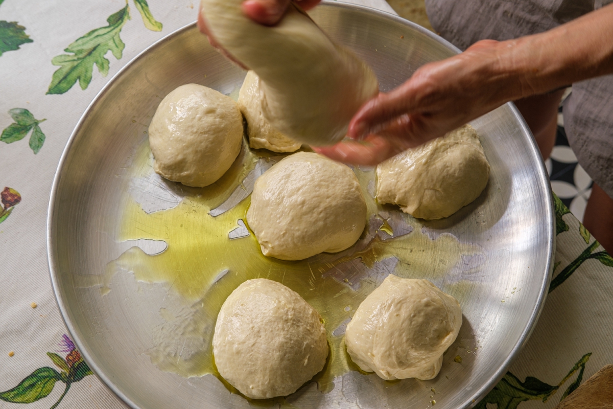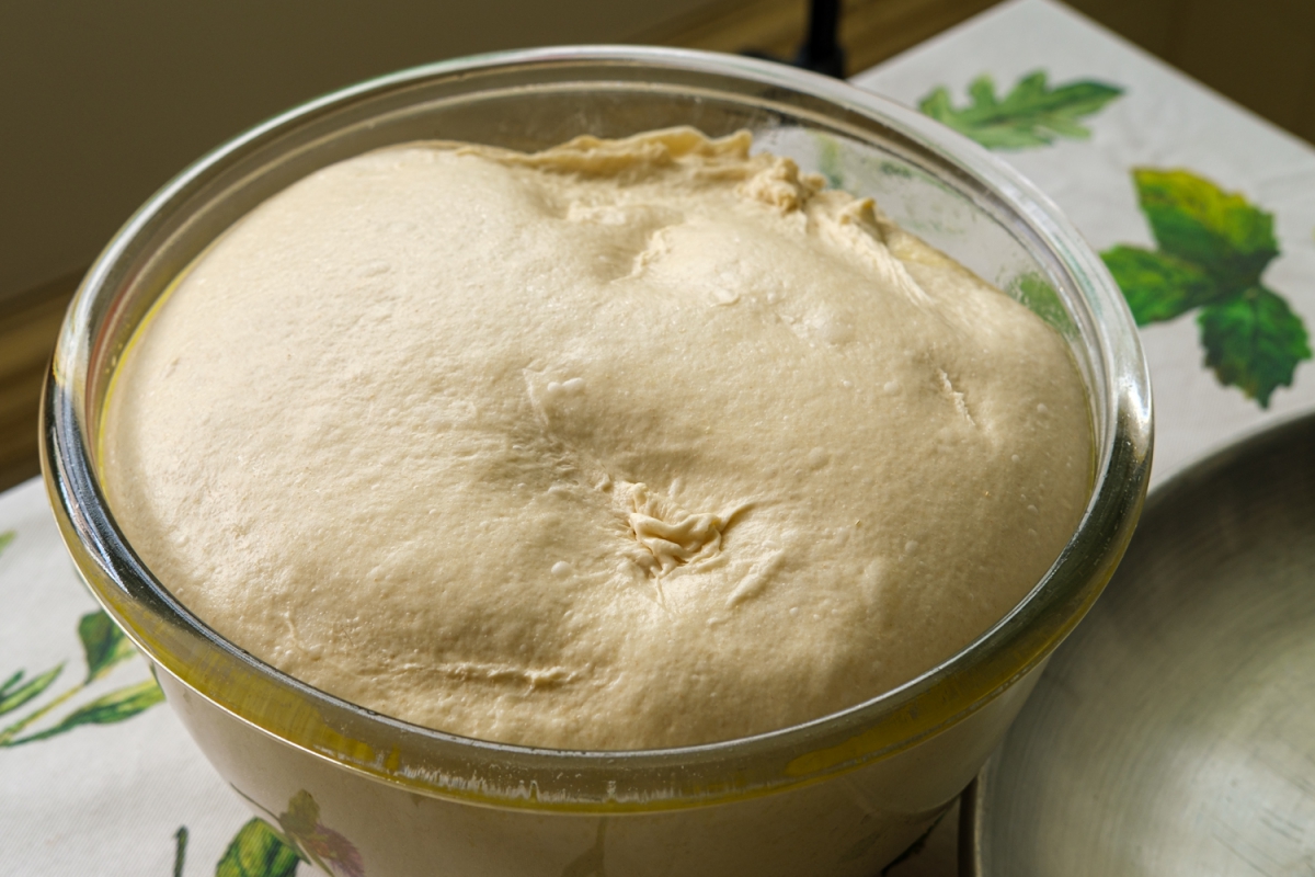 4. נשמן את הבצק הדביק בשמן זית שיעטוף את כל הכדור, נכסה קערה ונניח במקום חמים ונעים עד שהבצק מכפיל נפחו (כשעה ורבע)