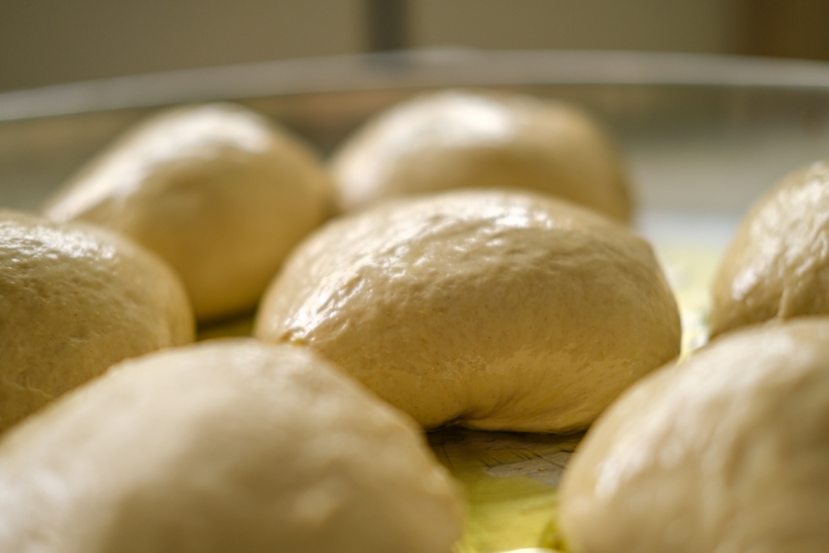 6. בינתיים נחלק ל6-8 כדורים. נעביר למגש משומן בשמן זית, נכסה בניילון שוב. כחצי שעה.