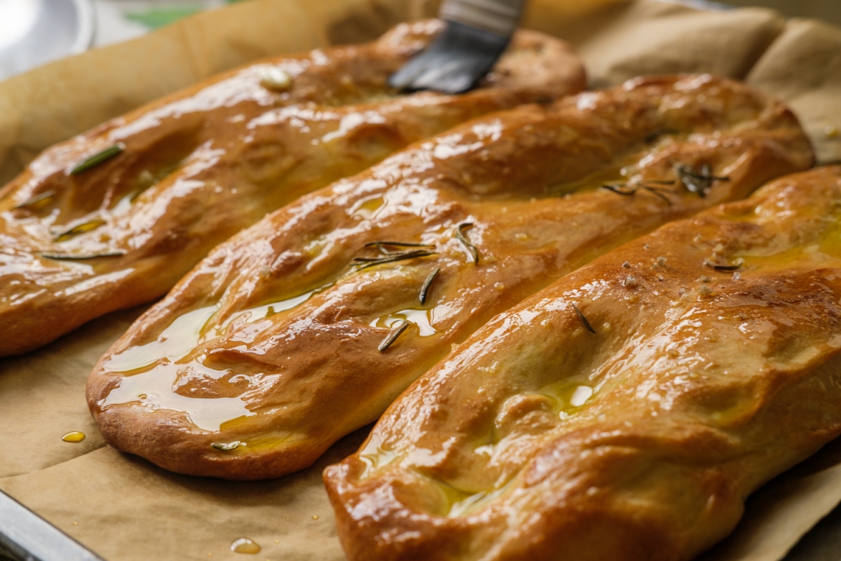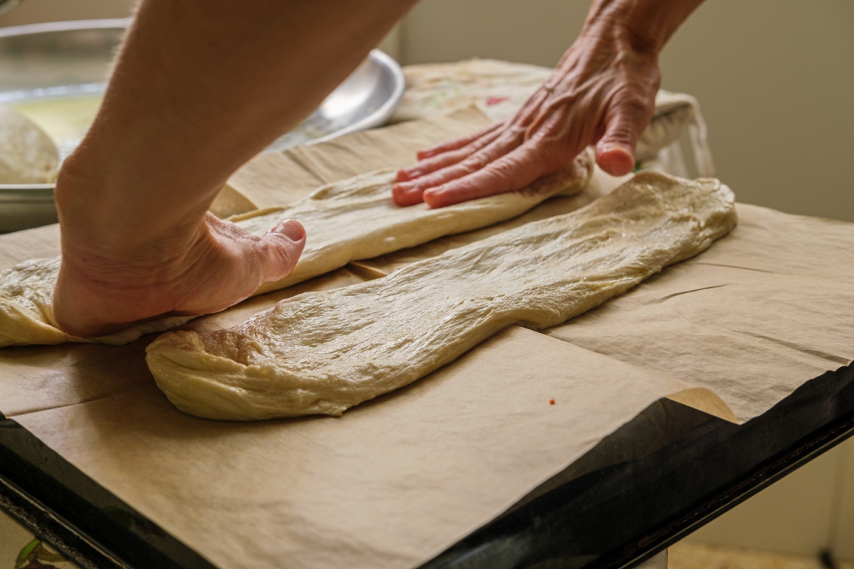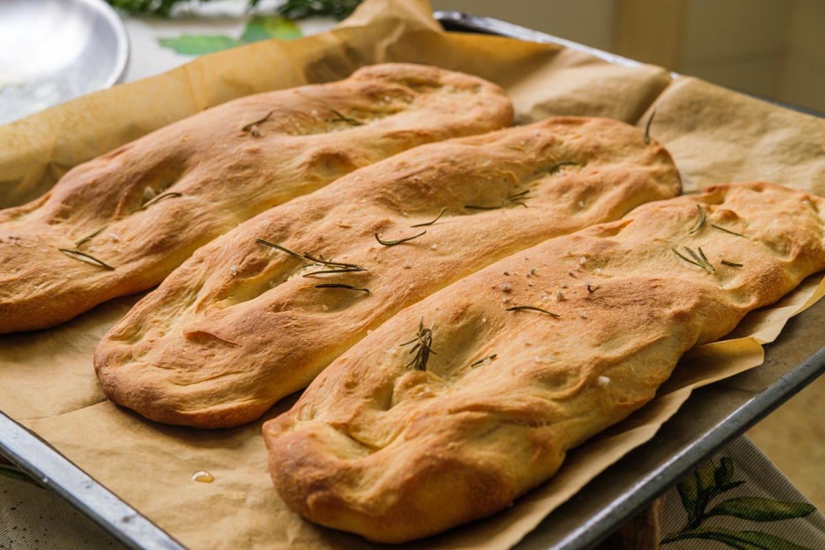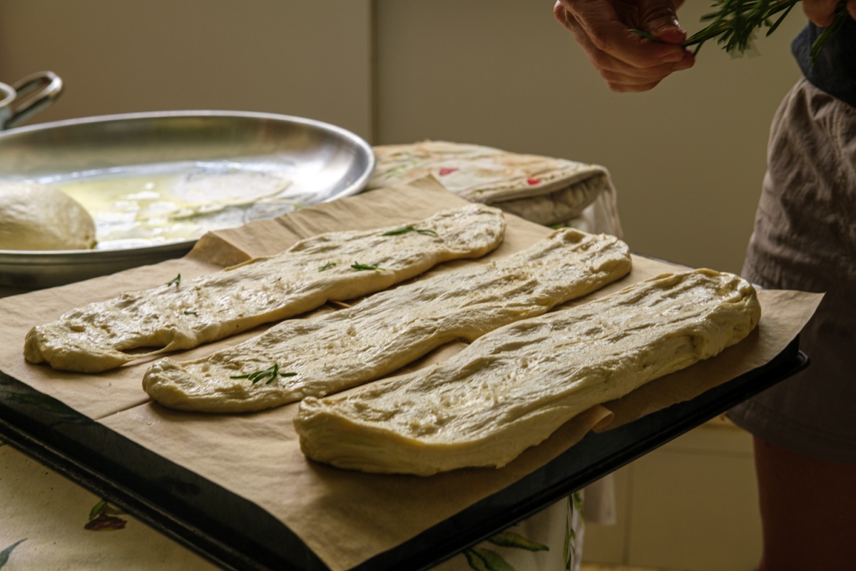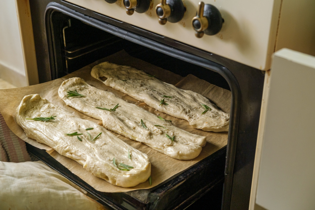 8. נכין בכל תבנית שלוש פוקאצ’ות ארוכות. נכניס ל לשלב האמצעי בתנור הלוהט כ-12-15 דק’.