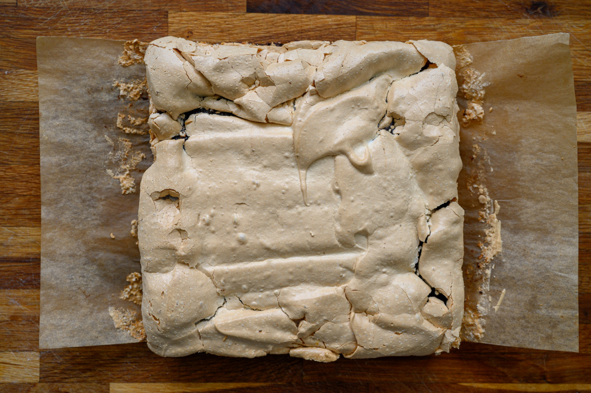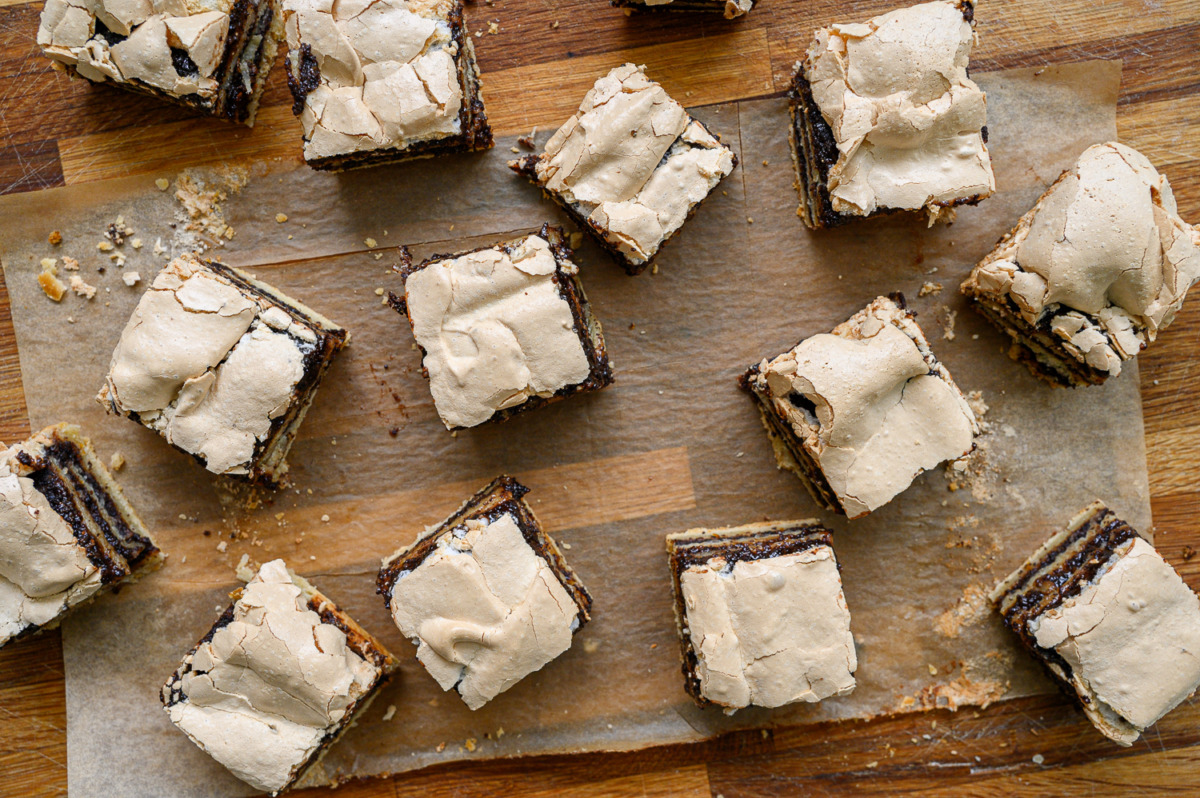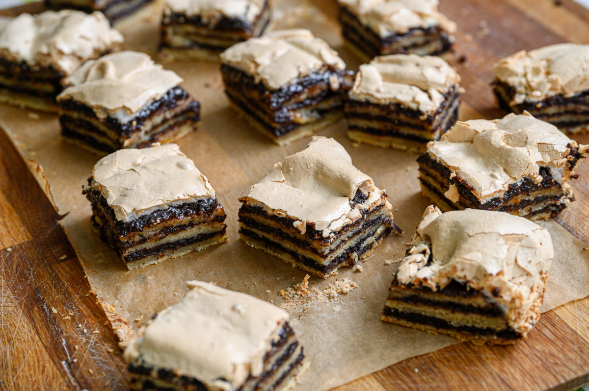 הרכבה: כך נבנה את העוגה: שכבת בצק, פרג, שכבת בצק, פרג, שכבת בצק פרג ולבסוף מרנג