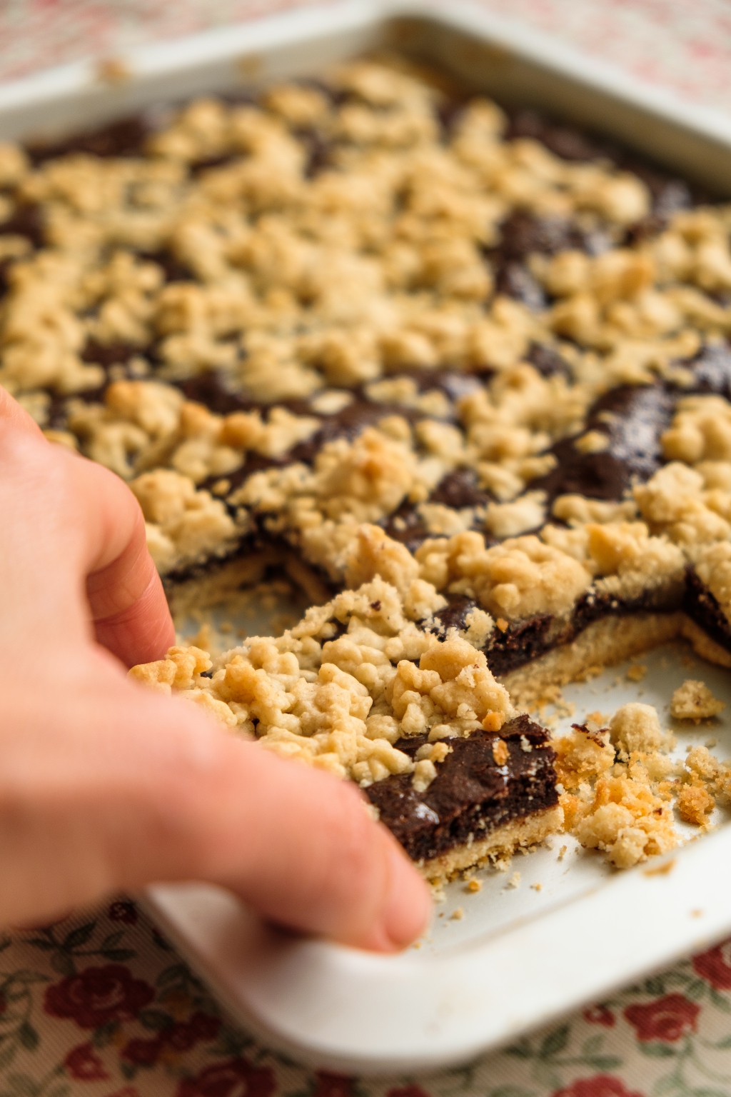 נמיס את השוקולד עם החלב ,הקקאו, השמן והסוכר, נערבב את בלילת הביצים טוב טוב אל תערובת השוקולד, ניצוק על עלה הבצק וממעל נפזר פירורים, לתנור חום 170 מעלות כ-חצי שעה, נקרר היטב נחתוך לחיתוכיות
