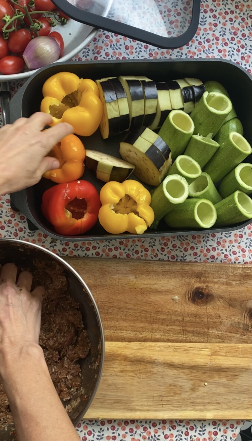 1. הירקות: נרוקן את הירקות – הקישואים עם קישואן, הפלפלים והחצילים נקלוף פסים ונחתוך לצמדים שכל דופן חציל בת 2 ס”מ. לא דק!!! (ראו תמונה)