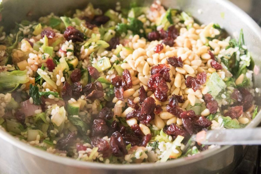 נטגן את כל היופי הזה בסיר שטוח , קודם הבצל , קישוא, סלק, סלרי, גזר, עגבניה, צנובר, חמוציות, נוסיף אורז, עדשים, לימון, עשבי תיבול, רבע כוס שמן זית, גרד מוסקט, רכז רימונים מלח פלפל, סומק, קינמון,