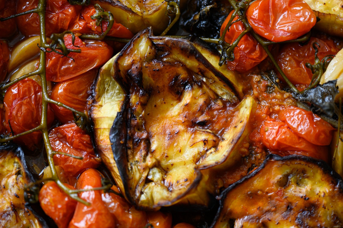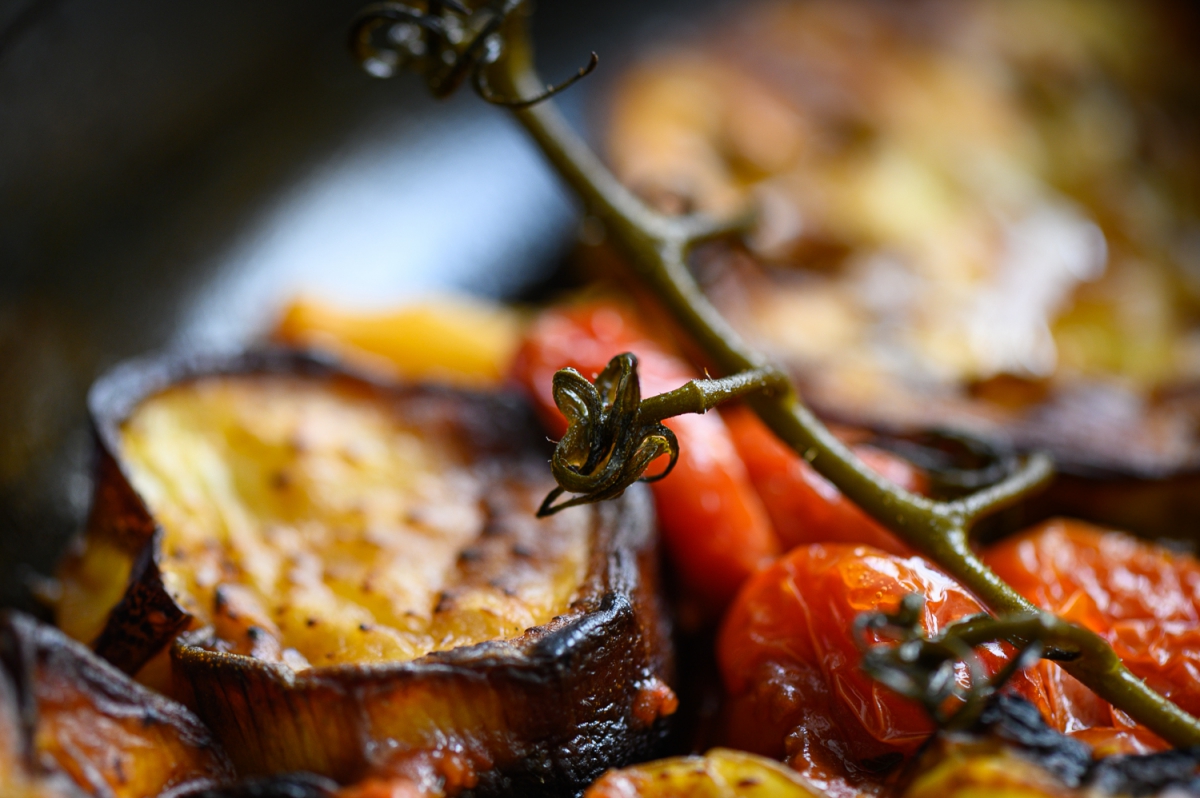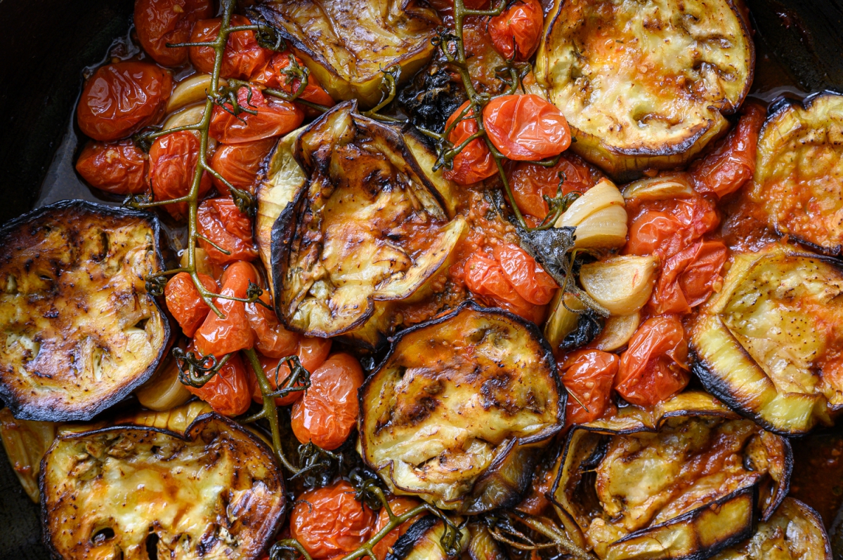 3. בתבנית פיירקס או סיר שטוח המקבל תנור ניצוק את אשכולות העגבניות המבושלות עם הנוזלים והשום, נפזר יפה יפה את החצילים האפויים שלנו ביניהם – נכניס לתנור 160 מעלות לחצי שעה – אם יש מדי נוזלים, נצמצם על כיריים.