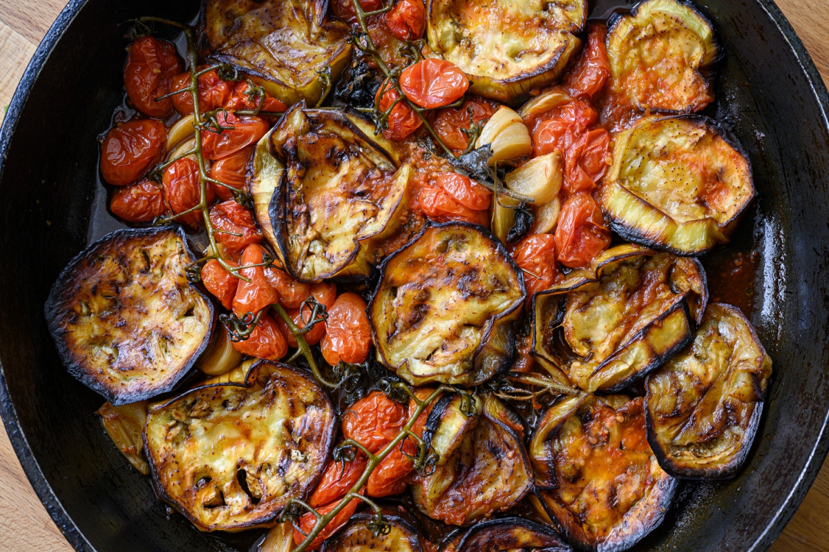 3. בתבנית פיירקס או סיר שטוח המקבל תנור ניצוק את אשכולות העגבניות המבושלות עם הנוזלים והשום, נפזר יפה יפה את החצילים האפויים שלנו ביניהם – נכניס לתנור 160 מעלות לחצי שעה – אם יש מדי נוזלים, נצמצם על כיריים.