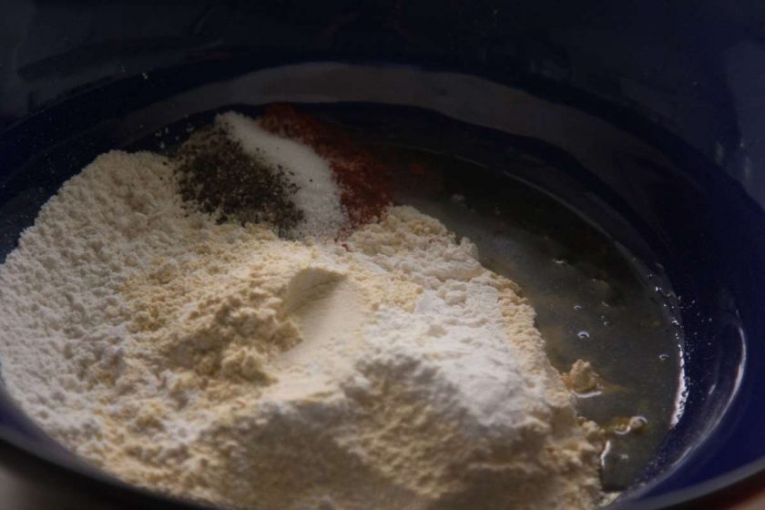 חצי כוס קמח איזה שיש, בעיני הכי טעים לערבב עם קמח חומוס קלוי), חצי כוס מים מהברז, 2 שיני שום כתושות, פפריקה/פלפל/מלח וכף שמן זית וערבב את הטיח..(אני השתמשתי בקמח חומוס קלוי מעורבב עם קמח רגיל כי זה מה היה לי)