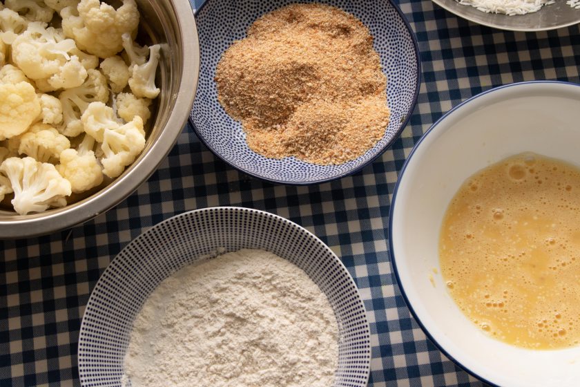 2. נטבול את פרחי הכרובית בקערת הקמח משם לביצים ומשם לפירורי לחם