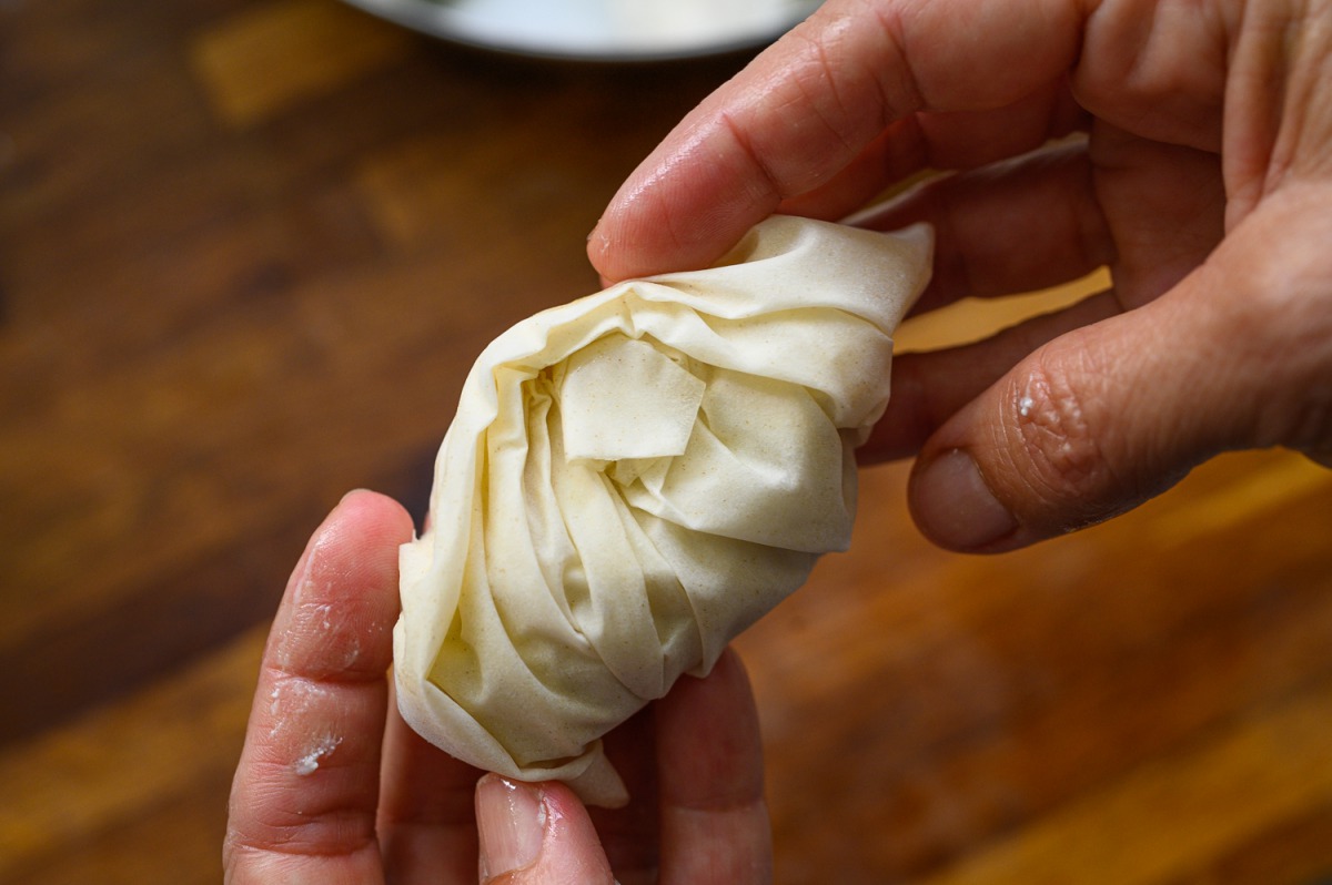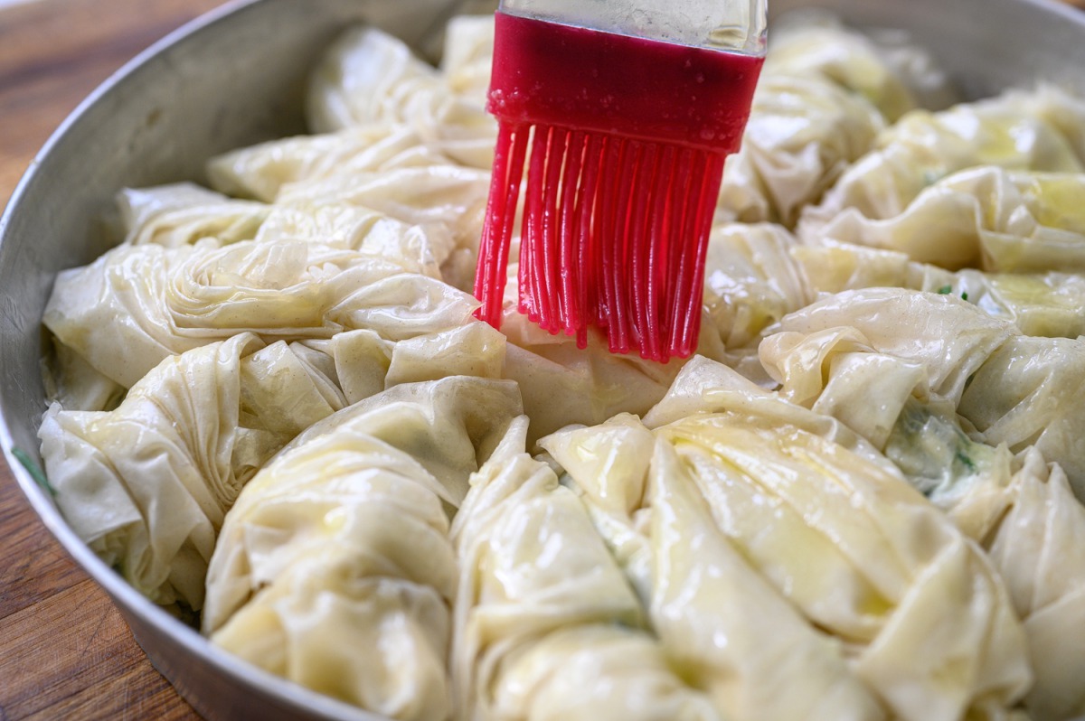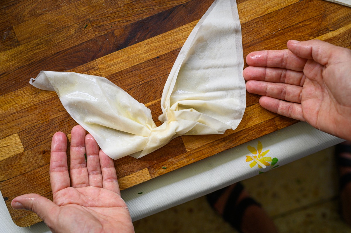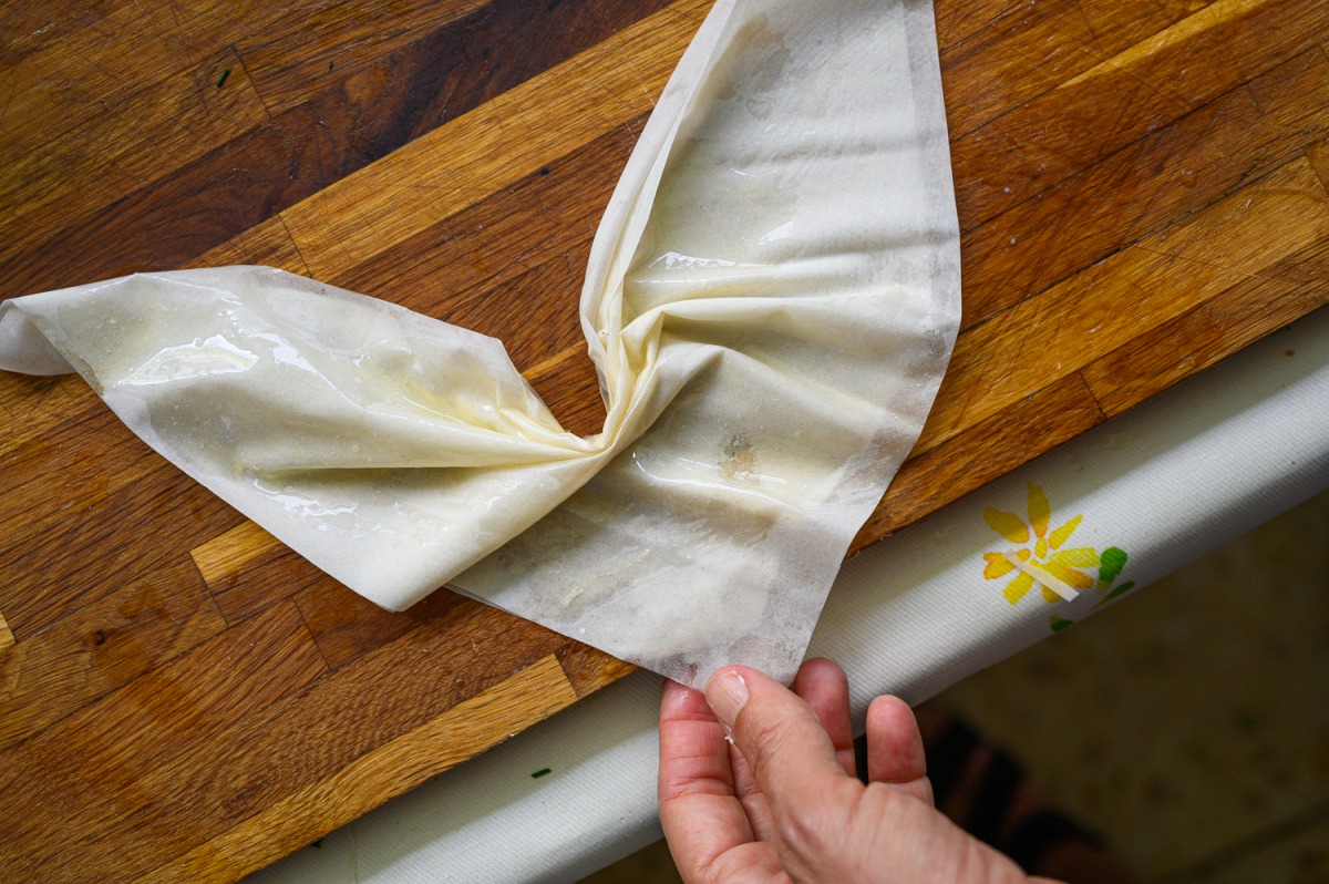 3. הגלגול הכייפי: את עלי הפילו נחתוך למשולשים, נבריש אותם בחמאה מומסת או שמן ונקווץ’ץ אותם כמו בתמונה, לכל משולש נוסיף כפית יפה של מילוי (ראו תמונה וסרטון) נצופף אותם בתבנית משומנת. ככה נעשה לכולם.
