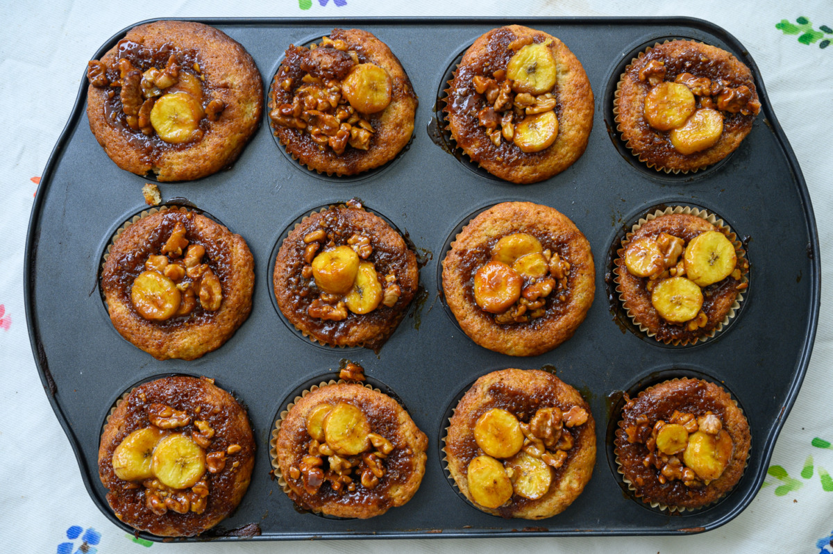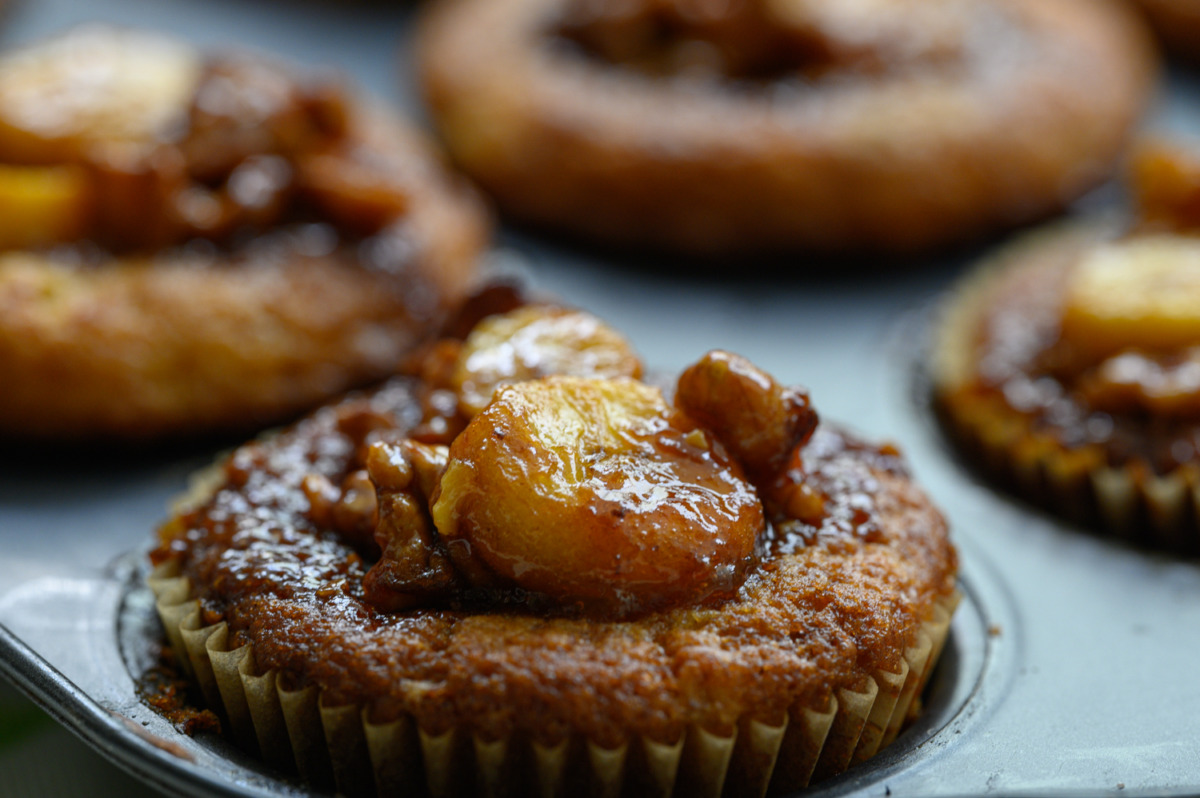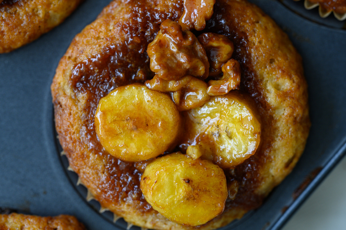 נוציא את המאפינס מהתנור (הם חיוורים וזה בסדר, לא יקרה להם כלום. הם יחכו קצת לקרמל וזה בסדר) נוריד הקרמל מהאש וניצוק על כל מאפין כפית של טופי קרמל עם בננות. נחזיר לתנור. נוריד ל160 מעלות כ-20 דקות נוספות עד קבלת צבע שחום יפה.