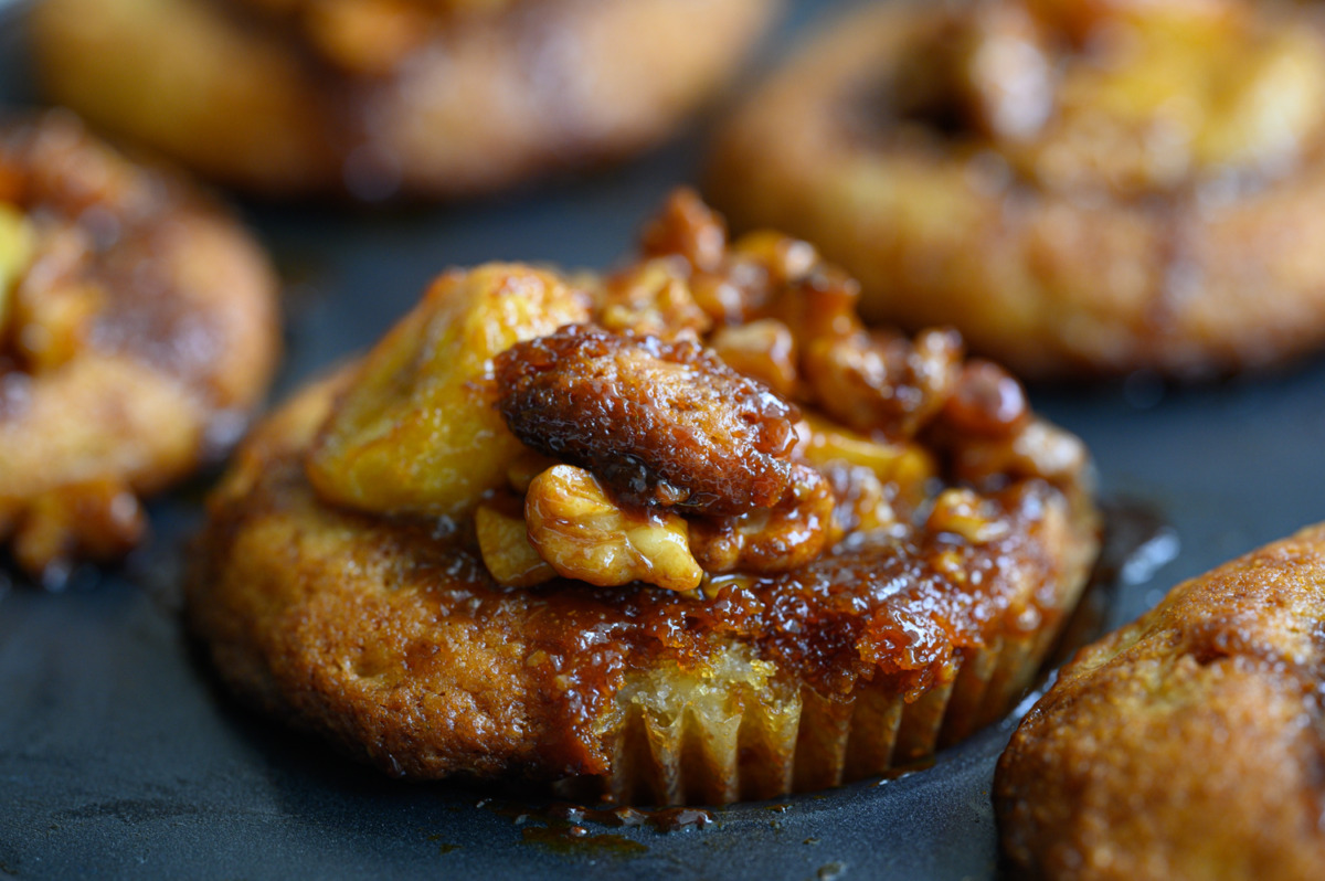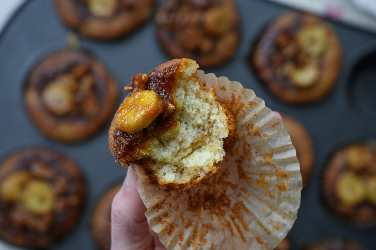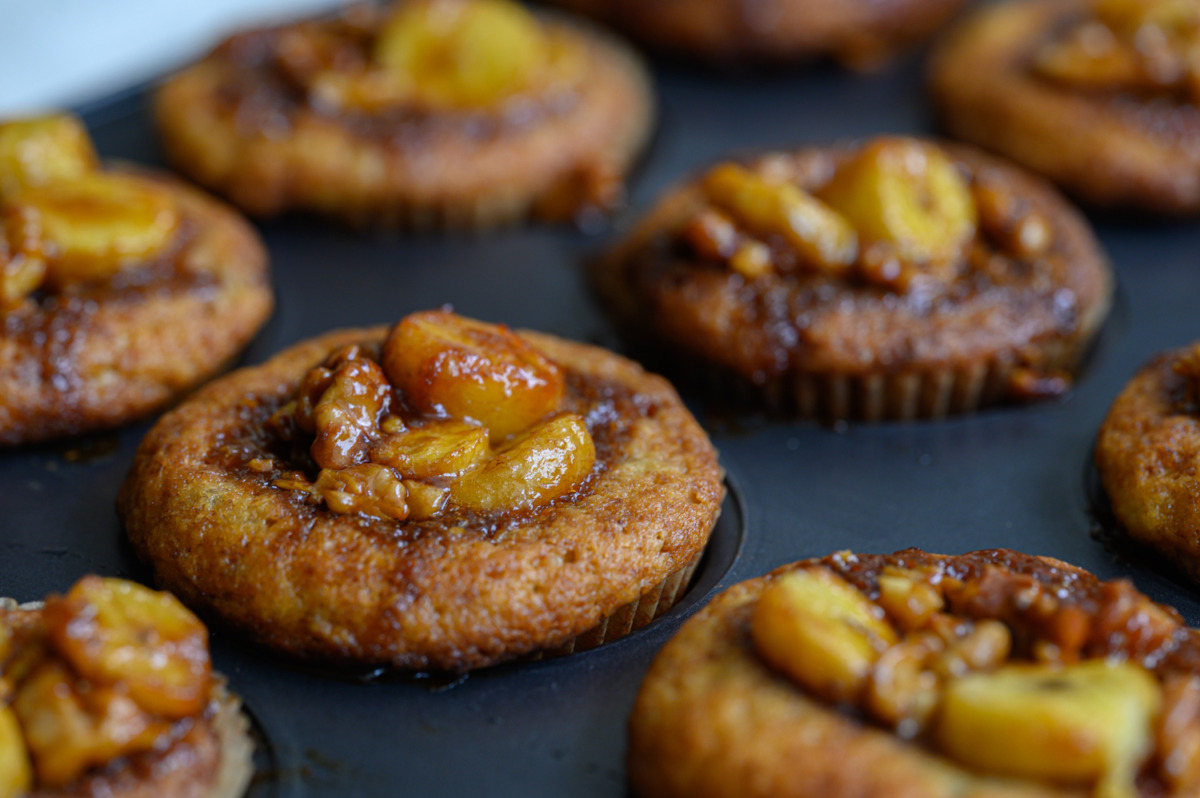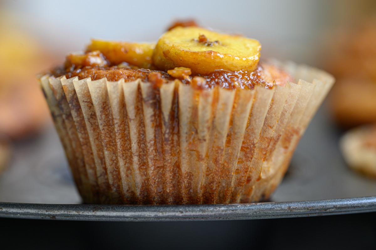 נוציא את המאפינס מהתנור (הם חיוורים וזה בסדר, לא יקרה להם כלום. הם יחכו קצת לקרמל וזה בסדר) נוריד הקרמל מהאש וניצוק על כל מאפין כפית של טופי קרמל עם בננות. נחזיר לתנור. נוריד ל160 מעלות כ-20 דקות נוספות עד קבלת צבע שחום יפה.
