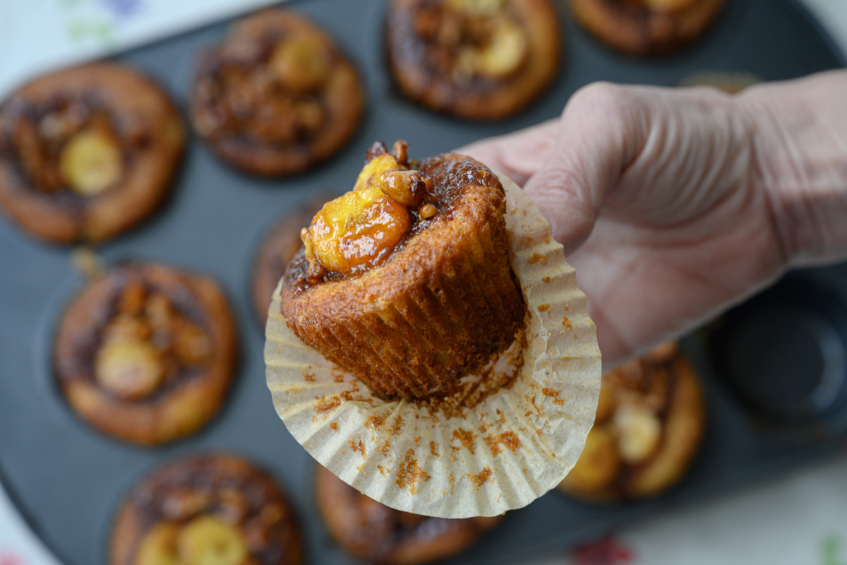 נוציא את המאפינס מהתנור (הם חיוורים וזה בסדר, לא יקרה להם כלום. הם יחכו קצת לקרמל וזה בסדר) נוריד הקרמל מהאש וניצוק על כל מאפין כפית של טופי קרמל עם בננות. נחזיר לתנור. נוריד ל160 מעלות כ-20 דקות נוספות עד קבלת צבע שחום יפה.