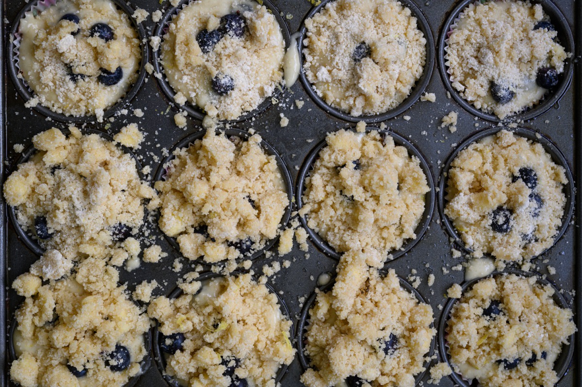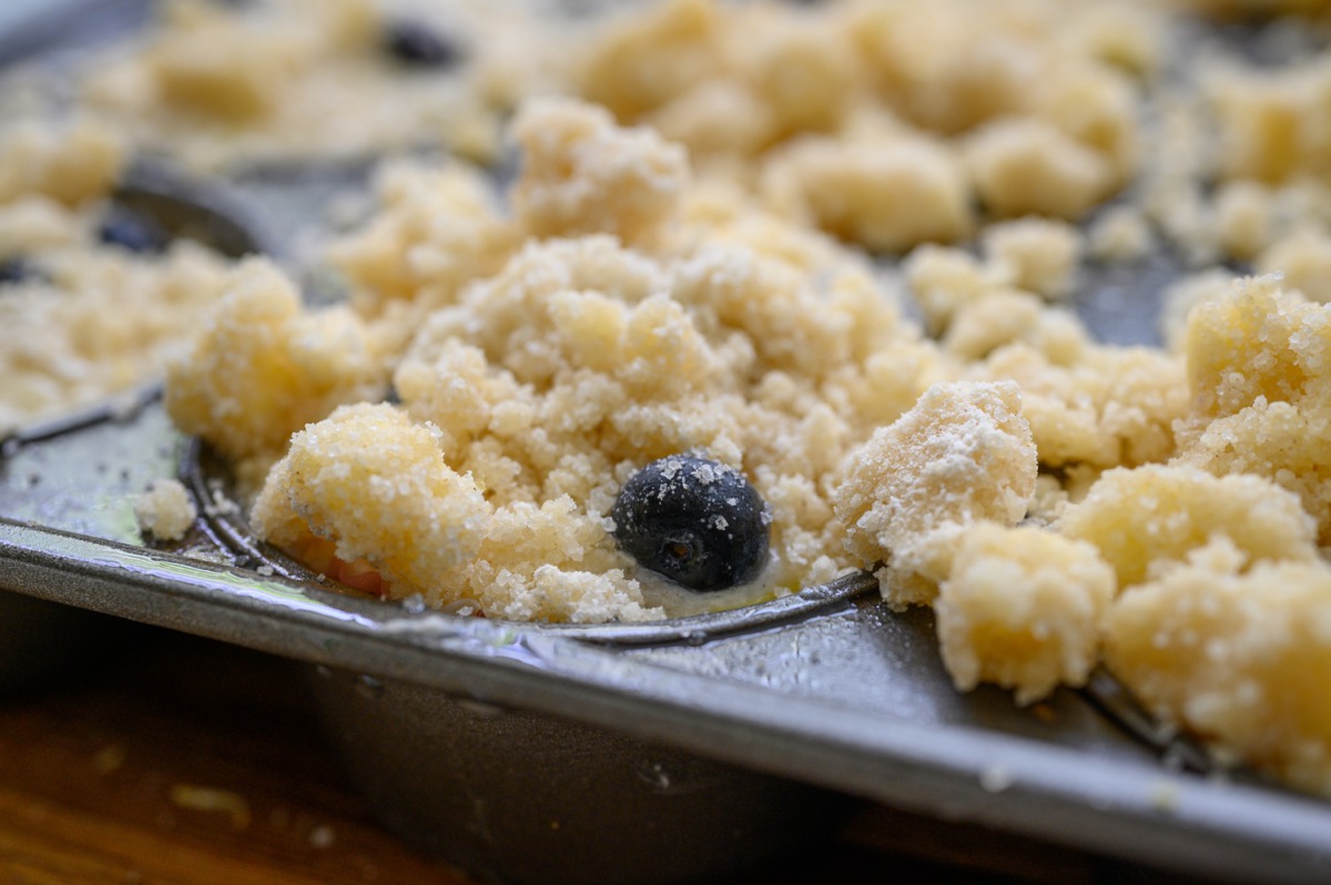 4. עם כף מגליצ’ים לכל שקע מן הבלילה, מכניסים ל5 דקות 170 מעלות את המאפינס לתנור מוציאים ומפזרים ממעל השטרוייזל
