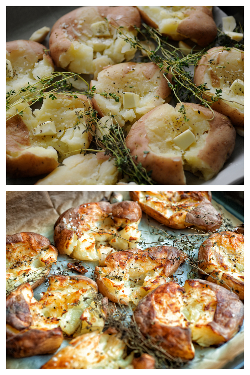 הנחתי את התפוחי אדמה על תבנית עם נייר אפייה. כל אחד זכה לקווץ’ ידני בעזרת שורש כף היד שלי . אחרי הקווצ’וץ’ הצורני קילפתי בעדינות מתבקשת רק את מרכז ליבת התפוח (בקלות).