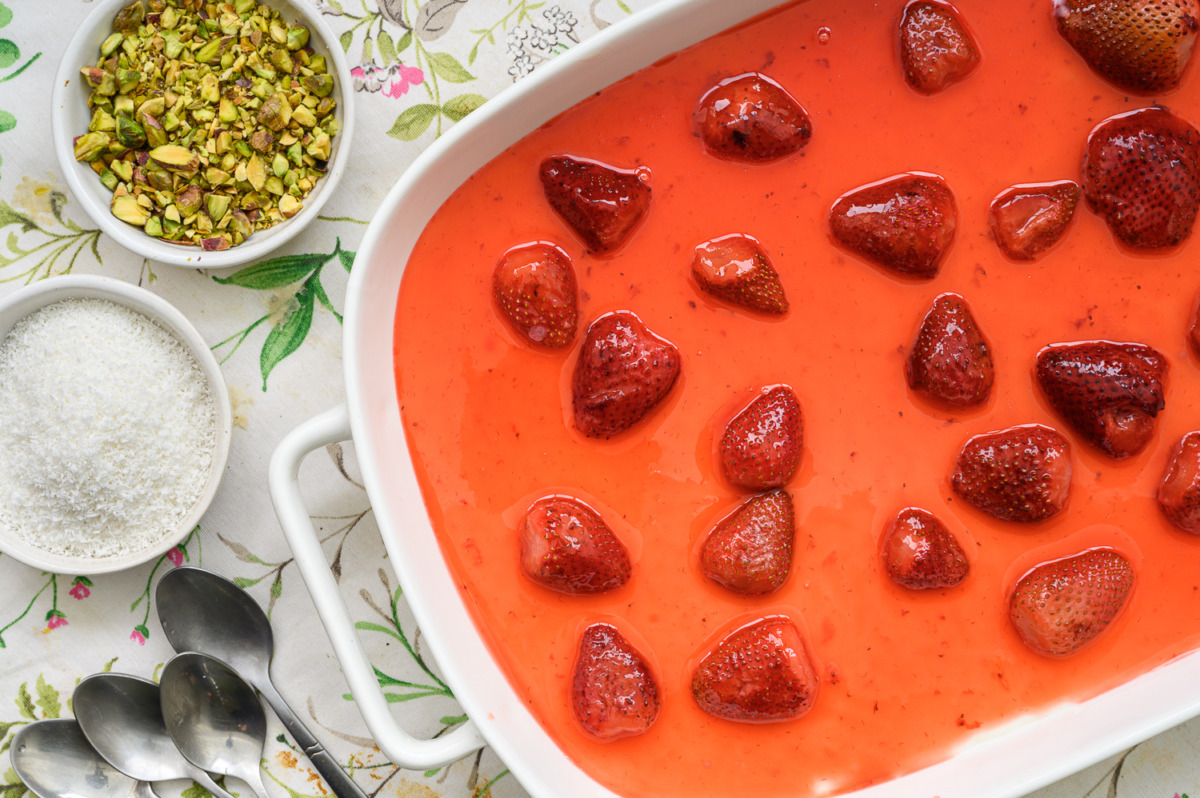 הסירופ: במחבת או קלחת קטנה נכניס את התותים, הסוכר, חצי כוס מים, רבעי הלימון ומי הורדים עד שהסוכר נמס, נוסיף כפית קורנפלור שעירבבנו עם רבע כוס מים לתותים, נערבב כ-2-3 דק’ עד שנרגיש שזה הסמיך מעט. נוציא את רבעי הלימון, נצנן ונפזר יפה על המלבי.