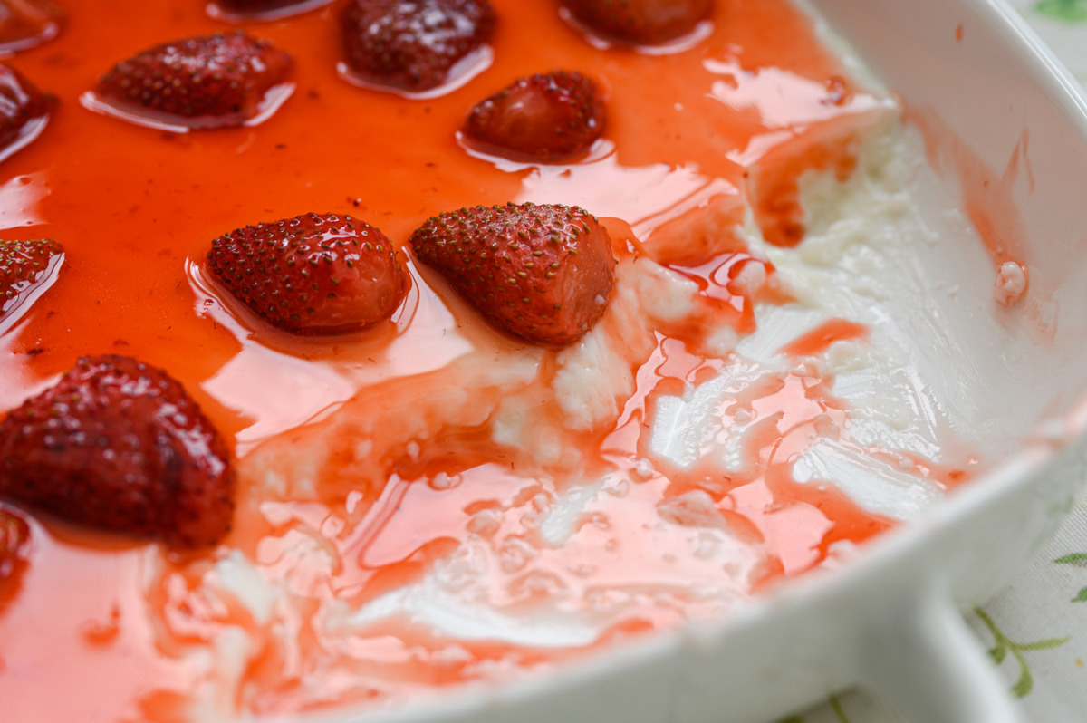 (אם יש גושישים, נעביר את המלבי דרך מסננת לכלי). נכניס למקרר (למלבי לוקח חצי שעה עד שעה להתייצב ואז אפשר ליצוק את רוטב התותים)