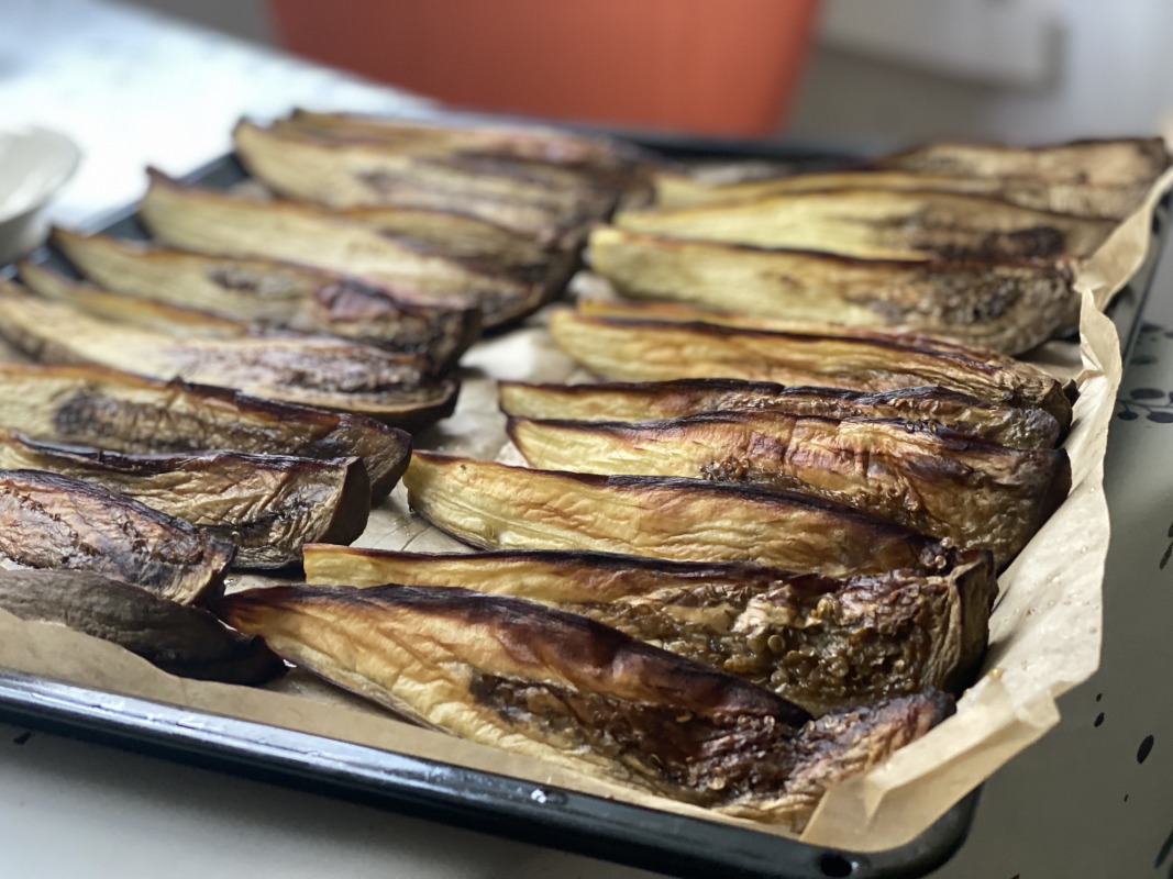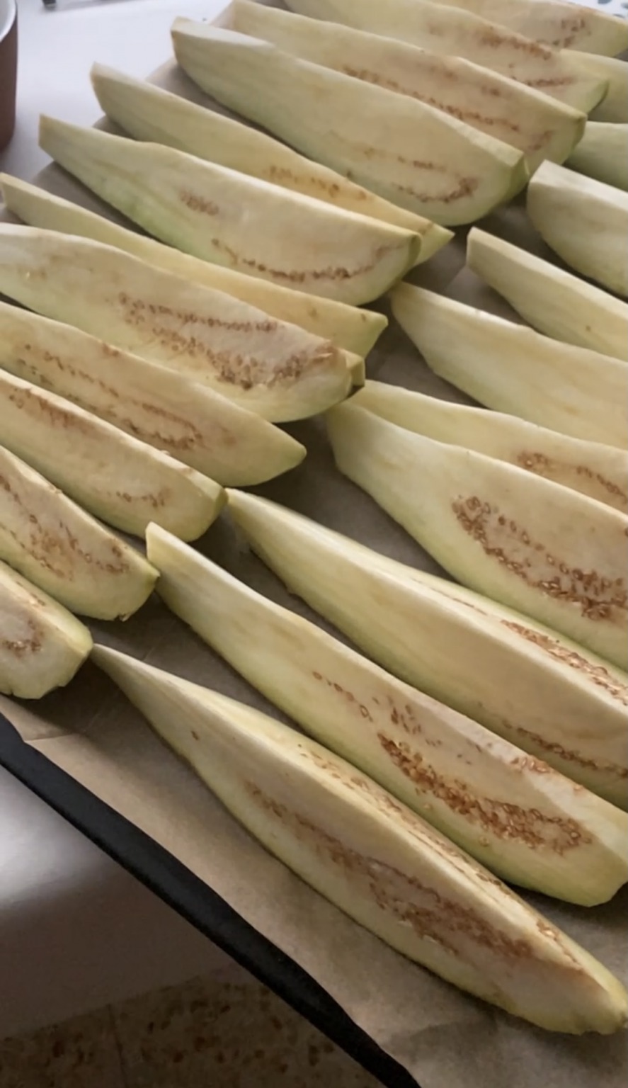 1. החצילים: נקלוף החצילים שיהיו ערומים לגמרי בלי כסות, נחתוך לאורכם לחצאים, נחתוך לאורכם לרבעים, נחתוך לאורכם לשמיניות. נזרה עליהם מלח וניתן להם להגיר זיעת חציל כרבע שעה. נספיג את הזיעה עם נייר סופג נבריש החצילים מכל הצדדים בשמן זית. שוב חוזרת ואומרת: כל הצדדים, נניח על דף אפייה בצפיפות מחממת נכניס לתנור לכ-20-30 דקות עד הזהבה יפה (נורא תלוי בתנור ובחציל שלכם, זה בערך הזמן). נניח בצד לקירור.