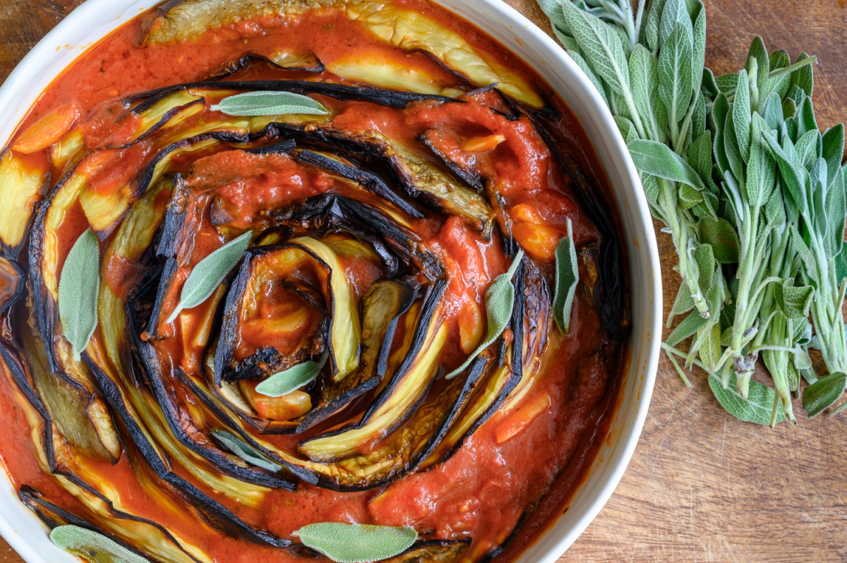 3. הרכבה – בתבנית פיירקס עגולה או תבנית עוגה עגולה: נזלף 2 כפות שמן זית וממעל 3/4 מרוטב העגבניות, נסדר את החצילים כמו פרח כמו שושנה/ספירלה עד האמצע. (כמו בתמונה), מעל נניח קרעי לחם או חלה, גבינה, שתי כפות שמן זית, את יתרת הרוטב, נפזר על הכל פרמז’נו, ונעטר בעלי טימין או אורגנו או בזיליקום.